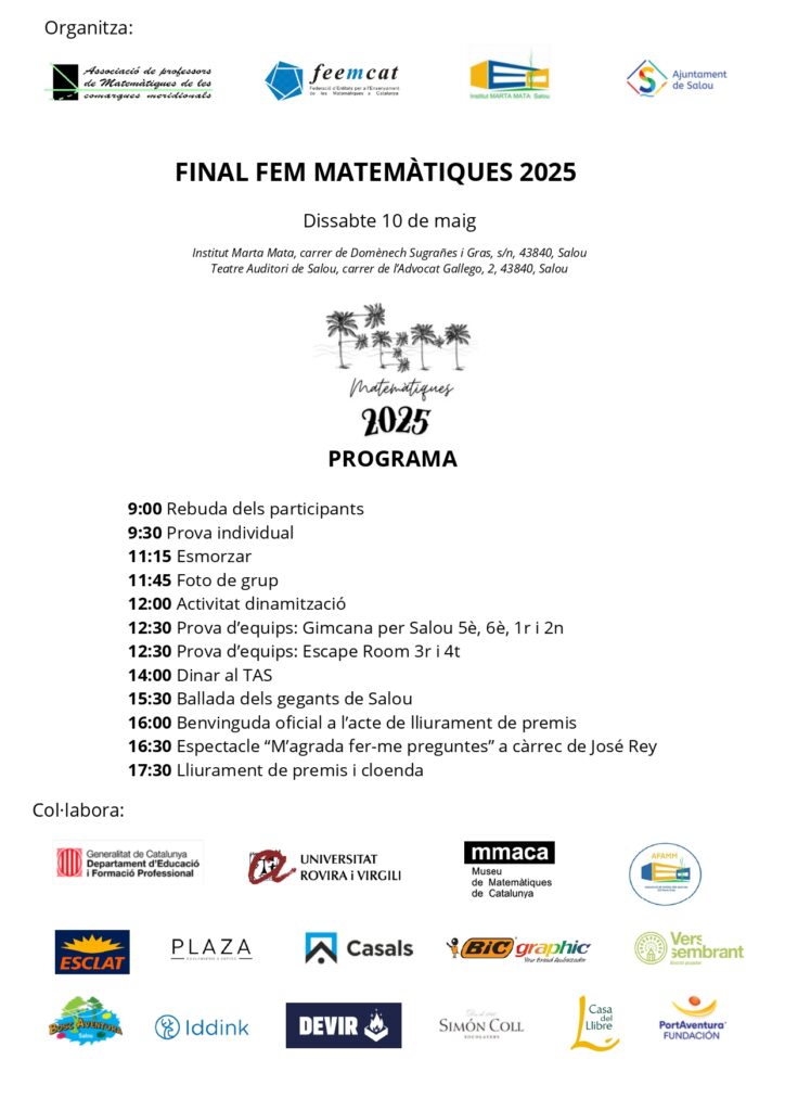 La jornada s’ha completat amb una ballada de gegants, un dinar per a tots el participants i l’acte de cloenda i lliurament de premis al TAS de Salou. Ha comptat amb l’assistència de l’Alcalde i la regidora de Serveis Educatius de Salou, la Secretaria de Millora Educativa del Departament d’Educació i Formació Professionals, la directora dels SSTT d’Educació a Tarragona i les presidentes de les associacions matemàtiques FEEMCAT iAPMCM. L’acte també ha inclòs l’espectacle “M’agrada fer-me preguntes” de José Rey, professor de matematiques i director del Museu de les Matemàtiques de Tarragona,