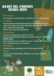 CONCURS RESIDUS ZERO, BASES I CARTELL imunoz7 imunoz726/04/24 S’inicia el concurs Residu Zero. T’animem a llegir les bases i a participar. Tots podem contribuir a la sostenibilitat del nostre entorn!
