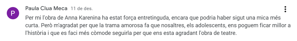 La novel·la original, d’unes mil pàgines, ha estat adaptada per Anna Maria Ricart Codina (a partir de la traducció original d’Andreu Nin del 1933) per a fer-ne una obra teatral d’unes tres hores, dirigida per Carme Portaceli, i, tot i que a alguns alumnes se’ls va fer de duració excessiva, a la majoria els va agradar l’experiència. Per exemple, Roger Santos opina que “el teatre no és una activitat que ens cridi molt l’atenció, tres hores seguides de teatre es fan complicades d’aguantar, però l’obra teatral ajuda a mantenir la concentració en ella”; o Dana Trancoso, que creu que “l’obra de teatre d’Anna Karènina era força llarga i, per moments, una mica lenta. Tot i això, la profunditat dels personatges es fa notar i la història és interessant. Potser amb un ritme més àgil hauria estat molt millor”.