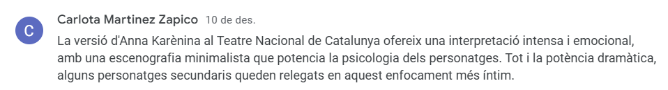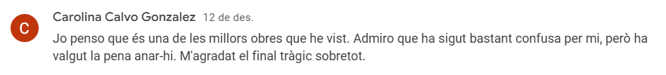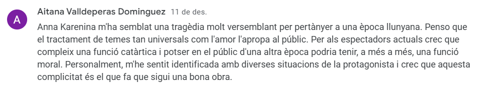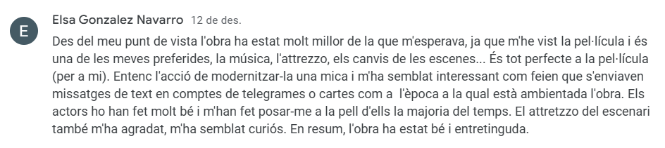 I no per últim, el menys important: aquelles crítiques que tenen en compte els conceptes literaris que l’alumnat de batxillerat ha pogut consolidar amb l’experiència teatral, com per exemple, l’excel·lència lingüística, les figures retòriques, els significats artístics, les funcions del teatre, etc.