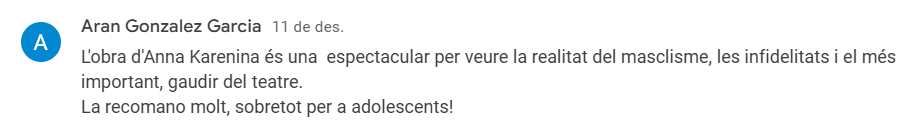 El passat 4 de desembre l’alumnat de 1r de Batxillerat va anar al Teatre Nacional a veure representat el clàssic realista de Tolstoi, Anna Karènina, amb Ariadna Gil com a actriu protagonista.