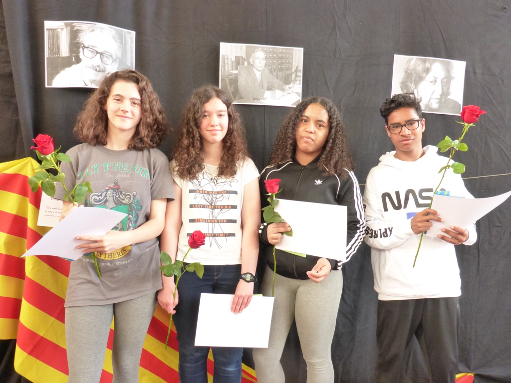 Després d’aquest tast teatral, ha tingut lloc el lliurament dels premis de poesia en llengua catalana i llengua castellana, en les categories de 1r cicle, 2n cicle i batxillerat. Els alumnes guardonats han estat els següents (les fotos no fan justícia als guardonats perquè alguns alumnes premiats no estaven presents a l’acte donat que, per exemple, els de quart d’ESO aquests dies estan de viatge de fi de curs):