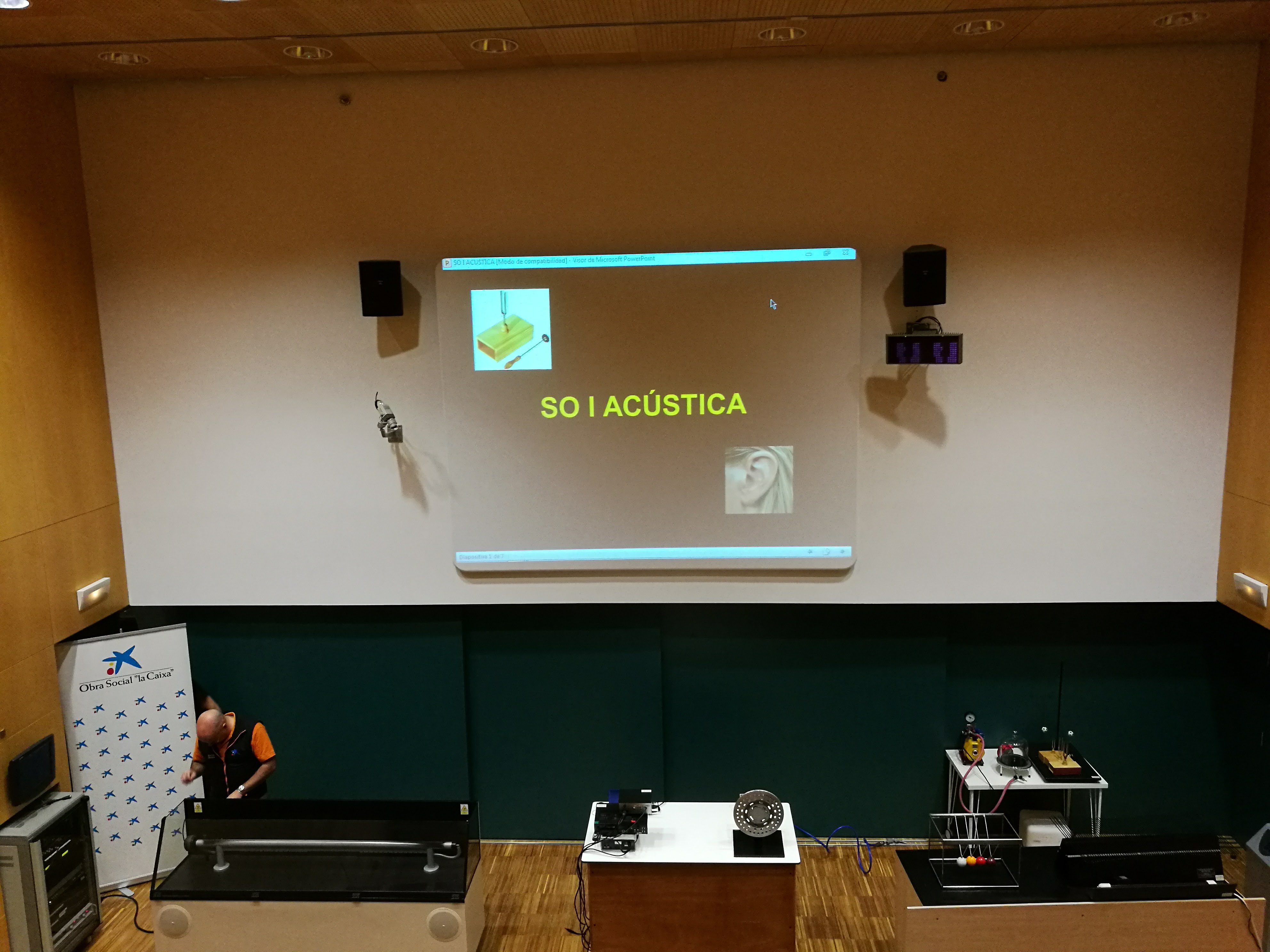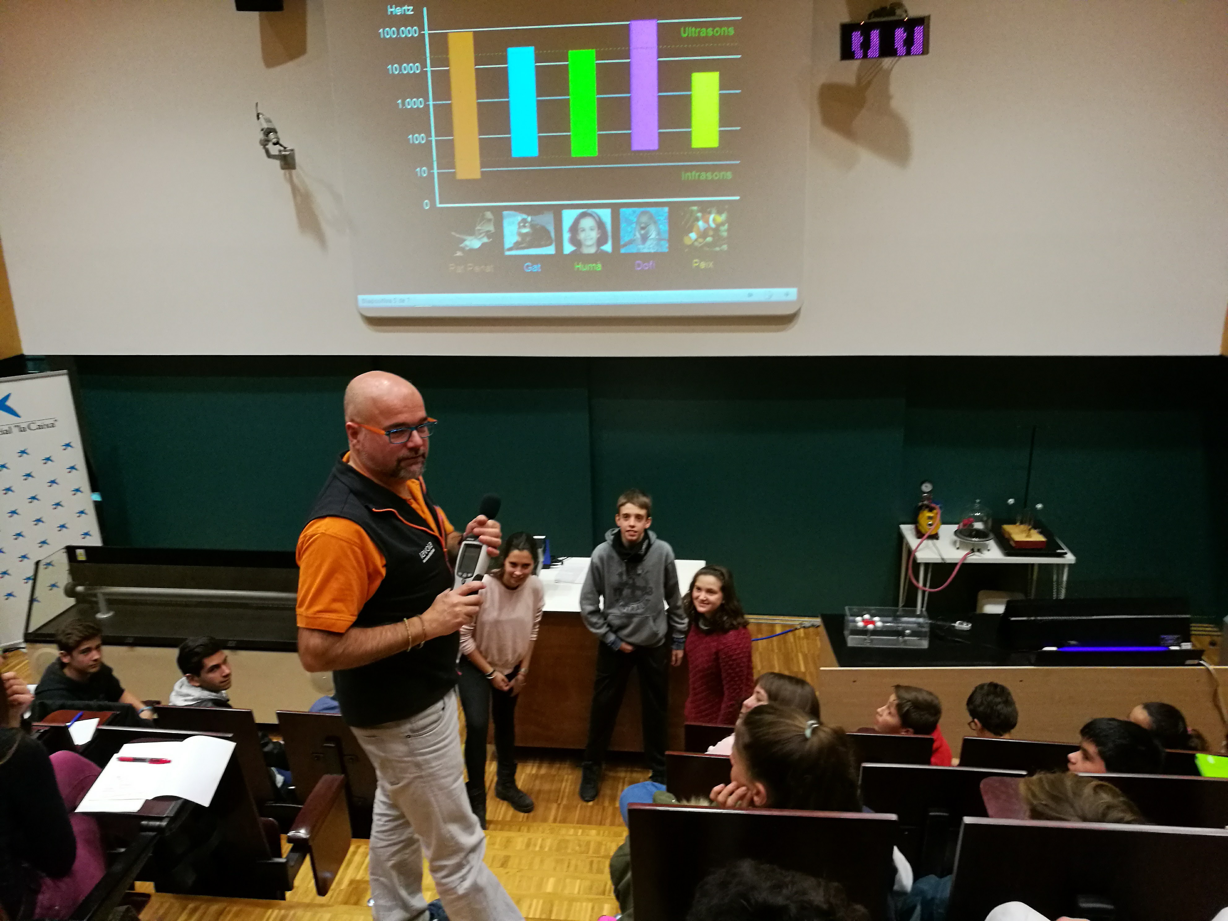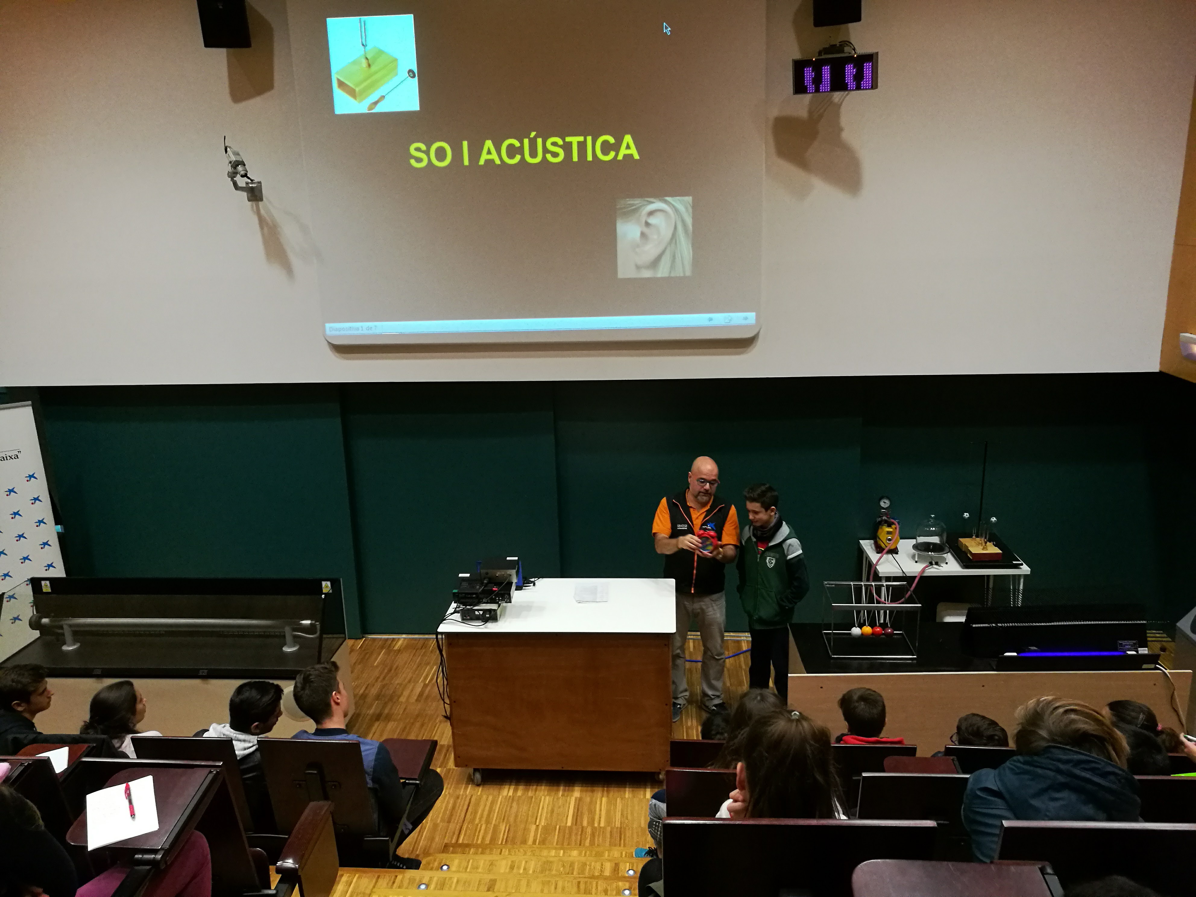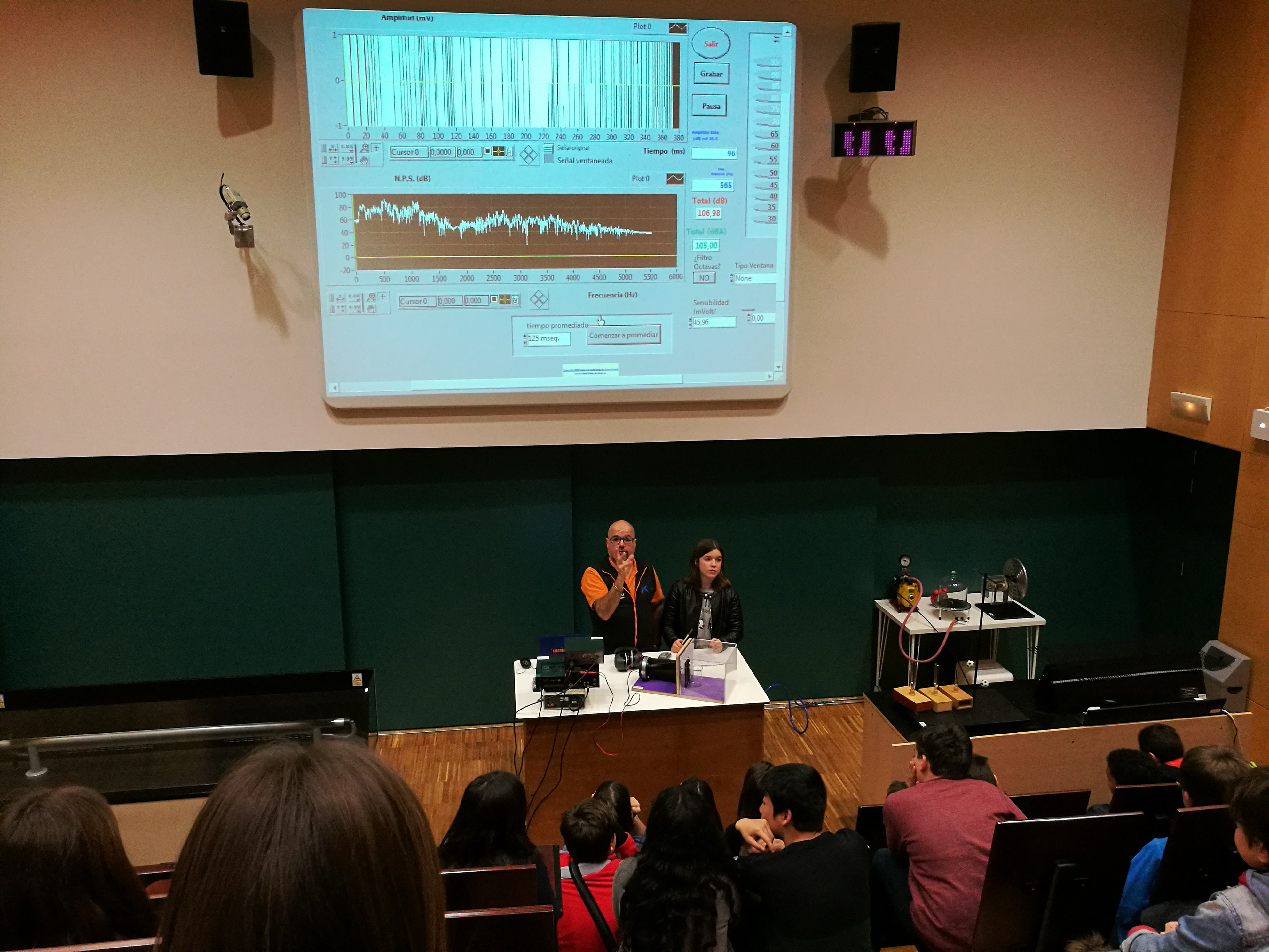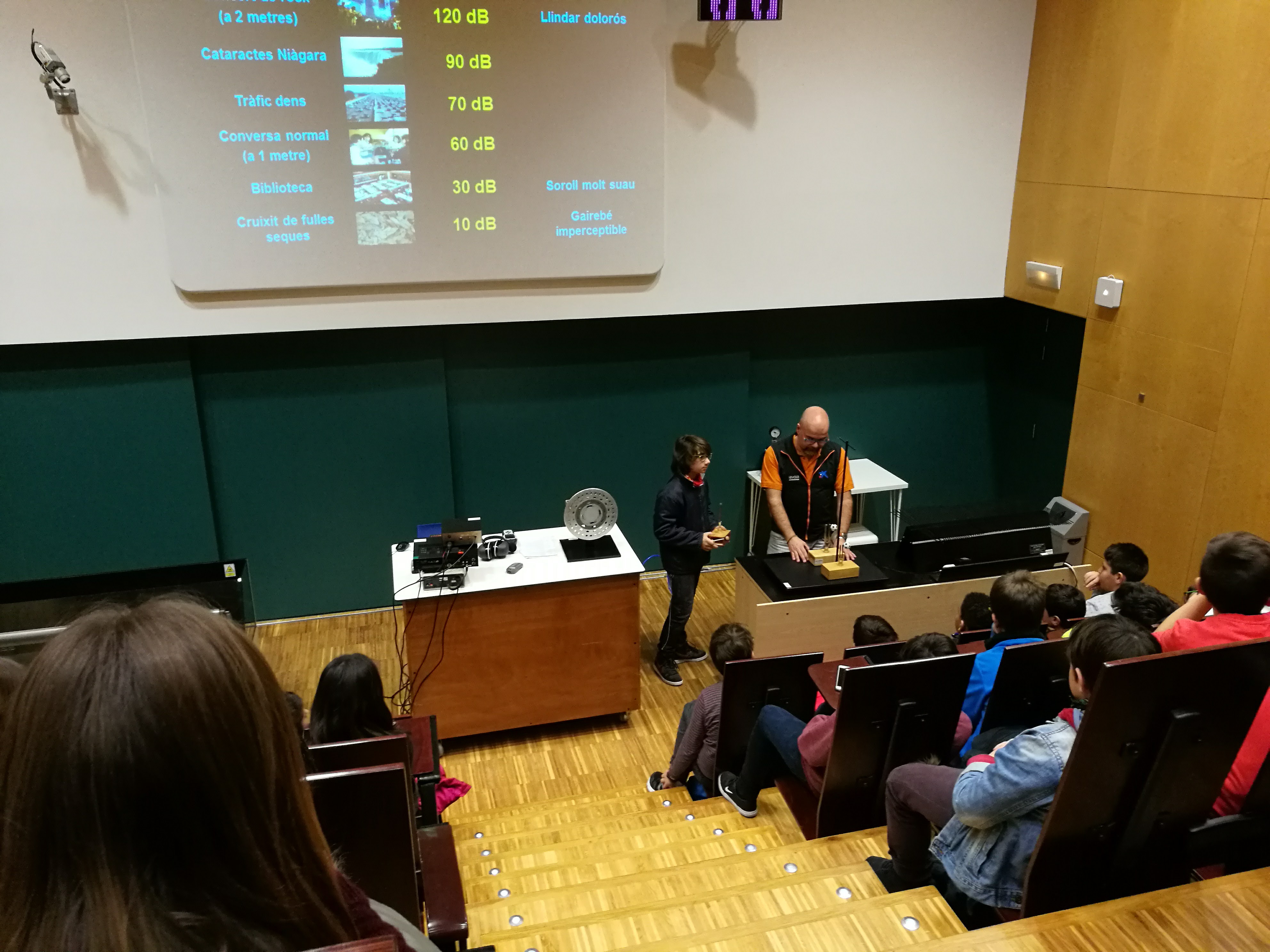 El primer que vam fer va ser anar a una sala on ens van explicar les característiques del so i la seva mesura en decibels, i com els diferents sons tenen diferents decibels com per exemple l’avió, el tren, etc. També ens van fer experiments molt curiosos com tapar un despertador i veure que cada vegada el so és més fluix perquè no té aire perquè el so es propagui.