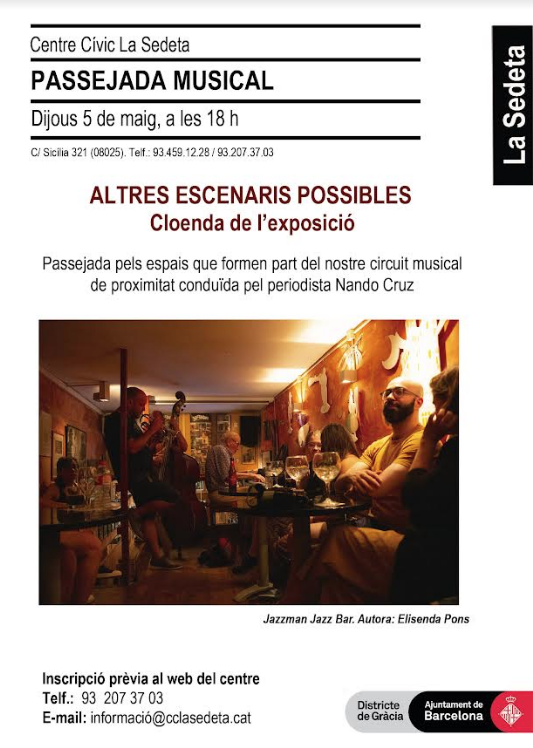 Us recordem que demà dijous a les 18 h, ens trobarem a la porta del Centre Cívic La Sedeta per fer la Passejada per descobrir altres espais musicals al Camp d’en Grassot.