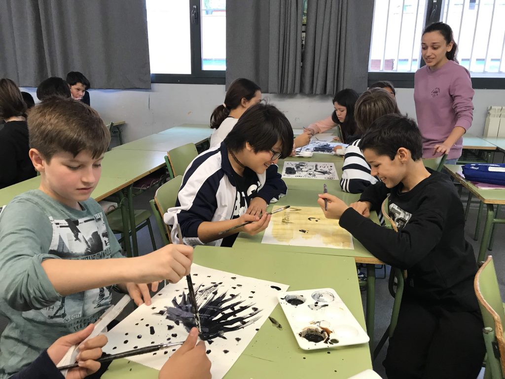 Aquesta setmana, els grups de 1r d’ESO han fet el taller ARTQUÍMIA, un projecte de col·laboració amb la Universitat de Barcelona, on l’alumnat ha après i ha pogut comprovar com es pot fer, amb químics que s’obtenen d’elements de la natura, la tinta que feien servir a l’època medieval. Es tracta de la reacció química que es produeix barrejant el SULFAT DE FERRO i l’ÀCID TÀNNIC, que reaccionen provocant l’oxidació cap al blau fosc de la tinta. Després de fer la pràctica, han pogut experimentar pintant amb els elements originals i amb la barreja resultant. Els resultats estaran penjats uns dies a l’aula de plàstica.