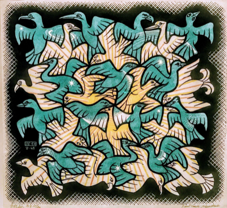Ens concretarem en les tessel·lacions, repeticions de patrons geomètrics que omplen una superfície sense deixar cap buit. Ho va aplicar a animals i persones per donar l’efecte d’infinit.