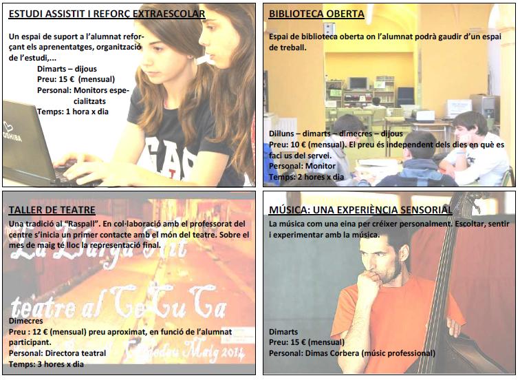 (NOVETATS: CAPOEIRA I MÚSICA). Com cada curs l’AMPA organitza, amb el suport de l’institut, diferents propostes d’activitats extraescolars. Us adjuntem la butlleta d’inscripció per a les famílies interessades. Recordeu que és indispensable un mínim d’inscripcions per tal que l’activitat es porti a terme. BUTLLETA CURS 14-15 Les inscripcions finalitzen el proper dimecres 8 d’octubre de