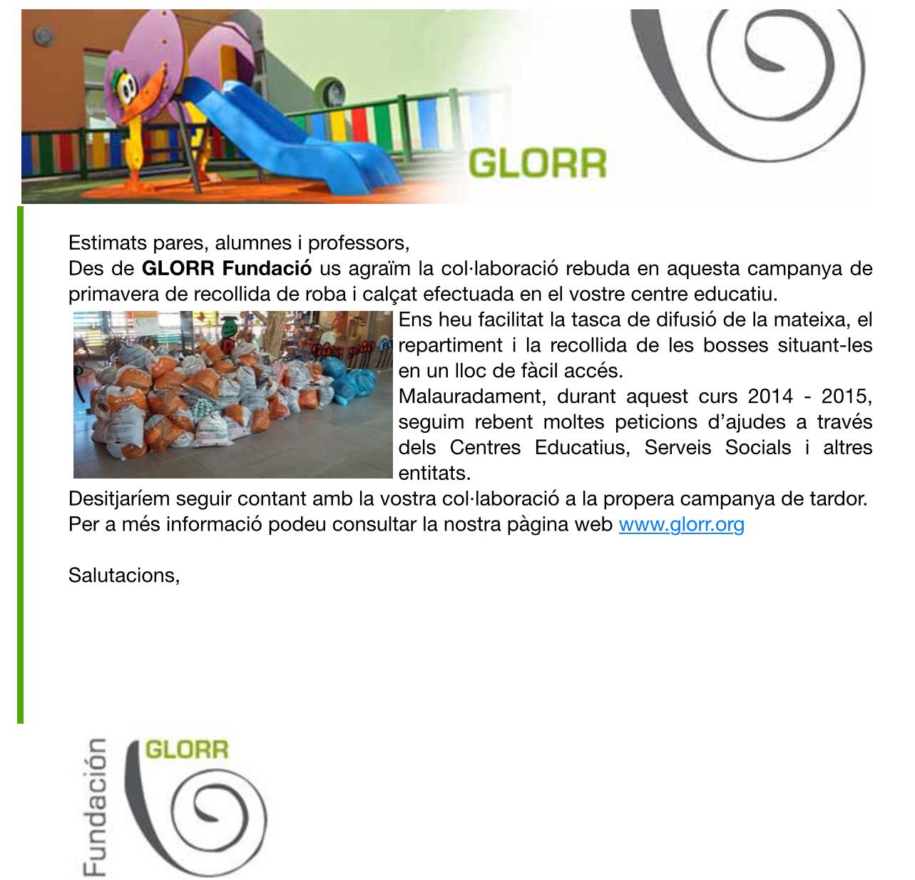 Carta de la Fundació GLORRPer admin / 04/06/2015 / General La Fundació GLORR ens ha enviat una carta per donar les gràcies a tothom per la recollida de roba que es va fer a l’institut. Us l’adjuntem. Gràcies a tothom per la vostra solidaritat.