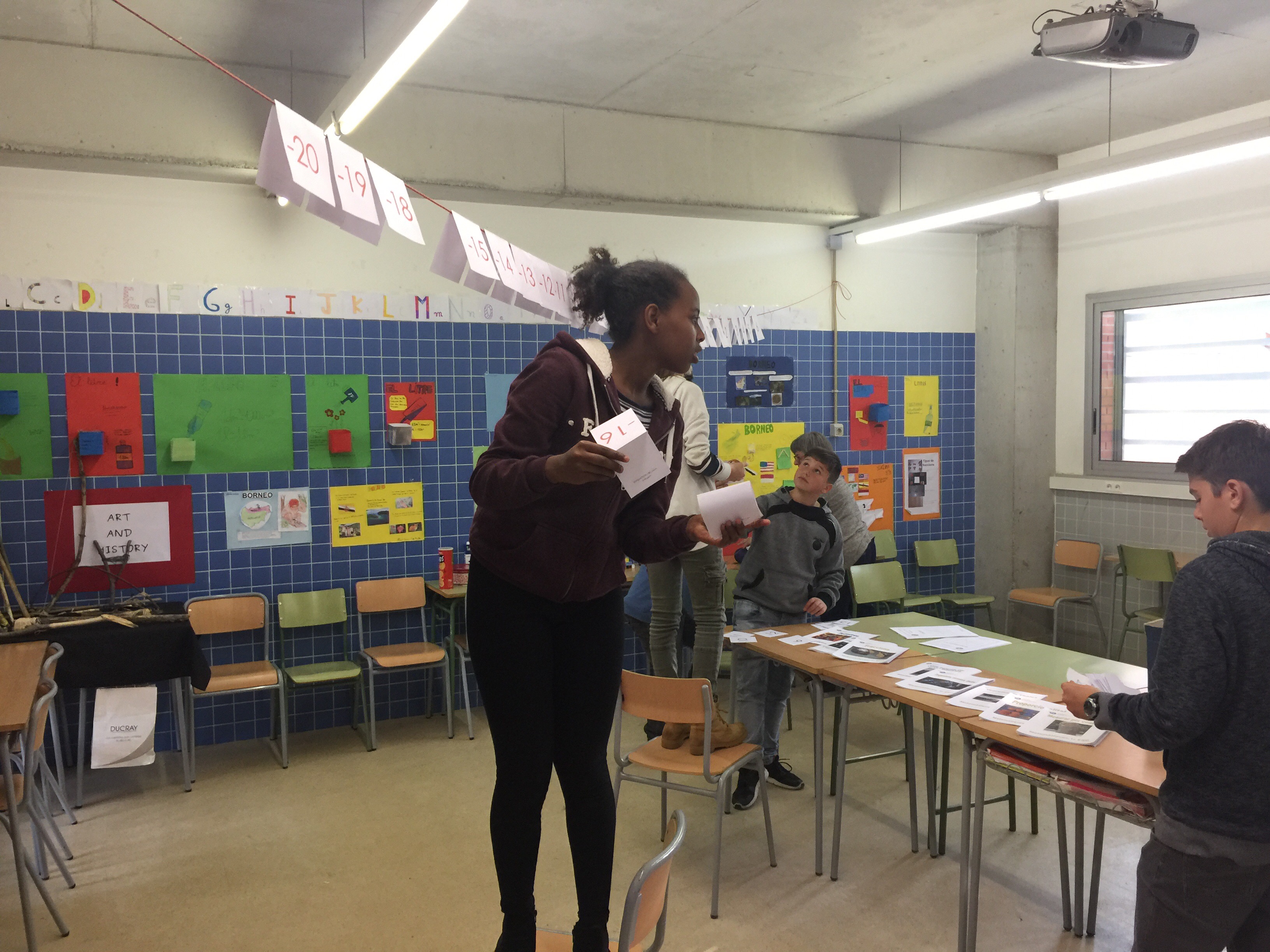 L’Abril ajudant els profes de matemàtiques penjant els nombres enters.