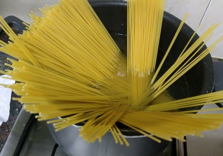 • Posem una olla a bullir, amb 1 litre d’aigua per cada 80- 100g d’espaguetis per persona. Hi afegim un xic de sal i un raig d’oli.