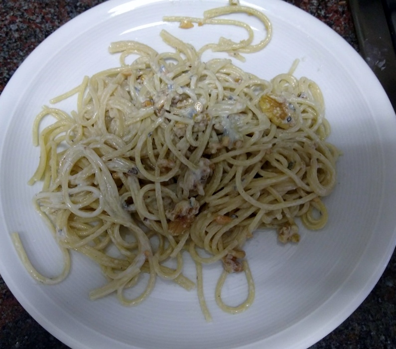 Espaguetis amb formatge blau i nous