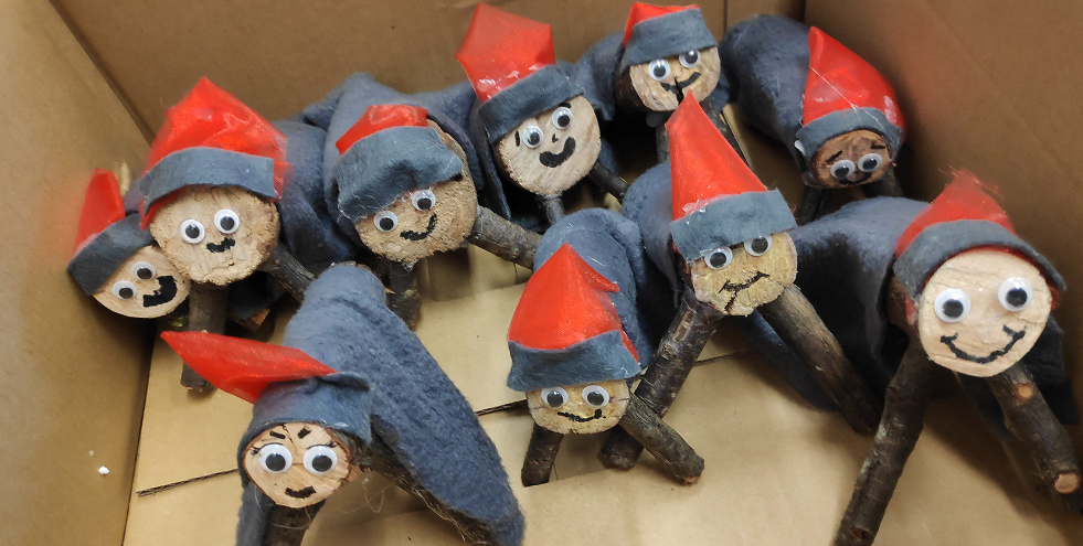 I la sorpresa final va arribar quan després de fer cagar el tió cantant la típica cançó els nens i nenes van aixecar la manteta i van veure que el gran tió havia cagat tios petitons per tots ells i elles. Aquests petits tios han estat fabricats pels alumnes de l’Institut al llarg dels últims mesos, ells mateixos van agafar els troncs, els van tallar , polir i van enganxar les mantetes i les barretines.