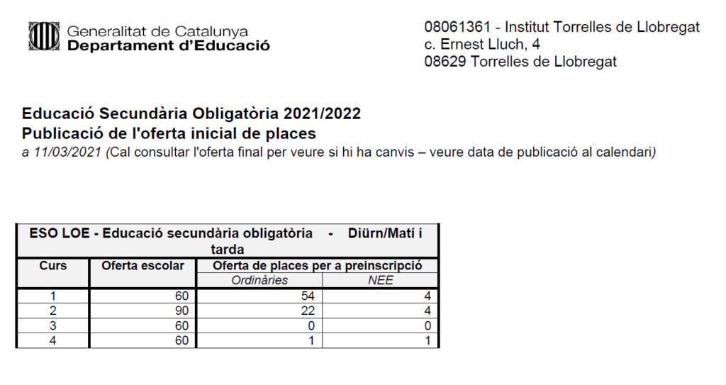 PUBLICACIÓ OFERTA INICIAL DE PLACES CURS 21-22 elinan11/03/21 Benvolgudes famílies, Avui fem pública l’oferta inicial de places per al curs 2021-2022.