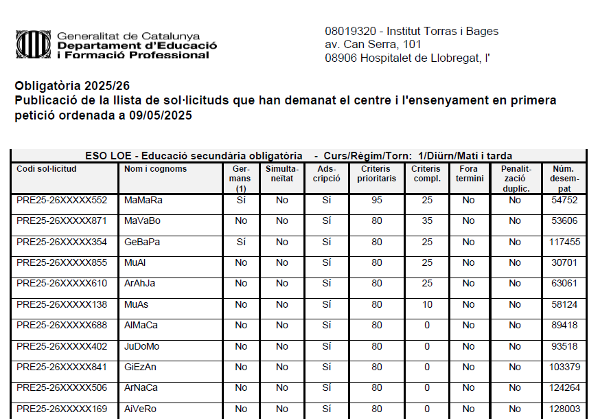 Batxillerat Publicació de la llista de sol·licituds que han demanat el centre i l’ensenyament en primera petició amb la puntuació provisional a 16/05/2025