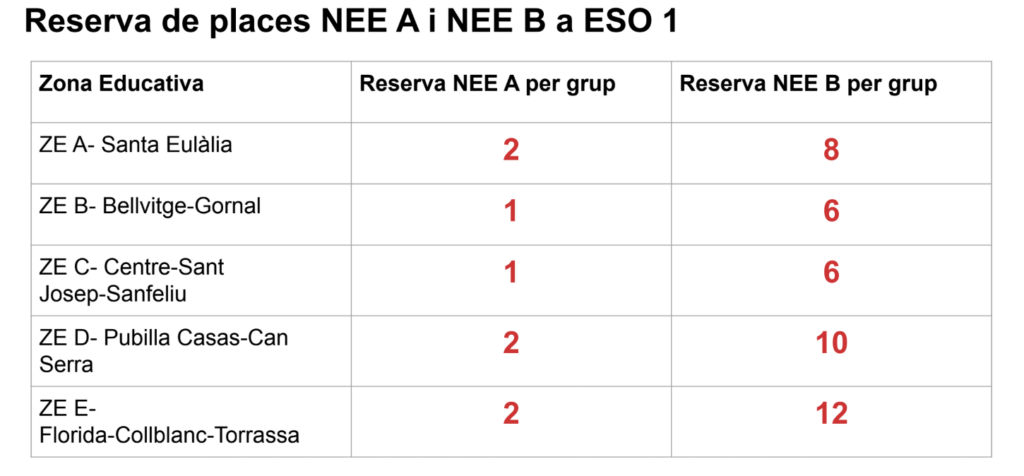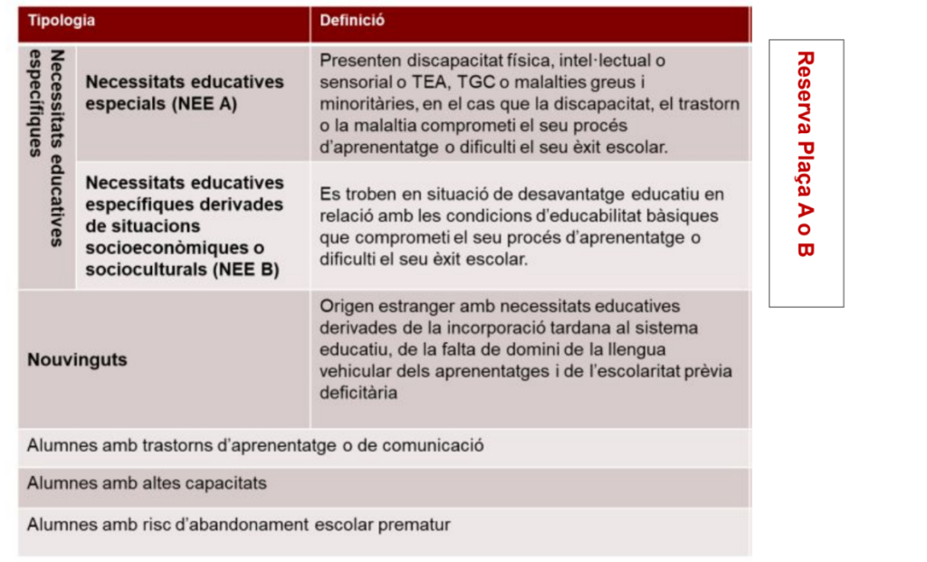 ● Es podrà informar alumnat NEE-A, NEE-B i NEE-AB. En el darrer cas s’assignarà a una plaça de reserva tipus NEE-A.