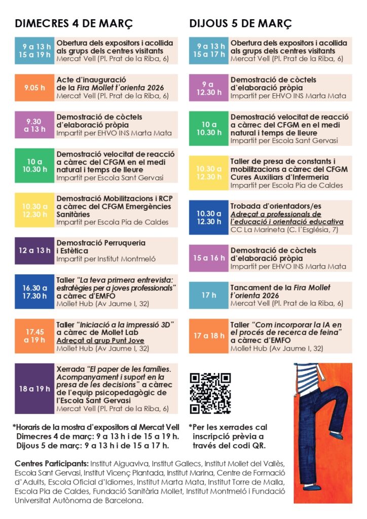 Els propers dies 4 i 5 de març tindrà lloc la fira d’orientació de la Formació Professional Mollet t’Orienta de la nostra zona al Mercat Vell de Mollet del Vallès. El nostre institut participa com cada any en aquesta fira donant informació sobre els nostres cicles formatius. Podeu consultar el programa de les activitats i els centres educatius participants.