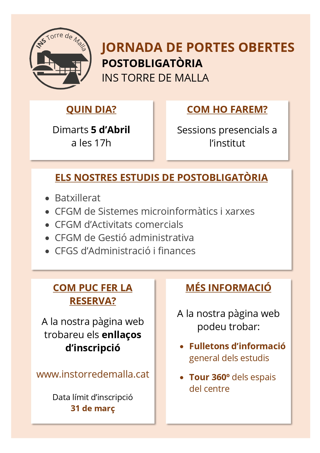 a continuació us podeu inscriure a les sessions presencials de portes obertes de postobligatòria de l’Institut Torre de Malla que es faran el proper dimarts 5 d’abril a les 17h. La data límit d’inscripció a les sessions és el 31/03/22