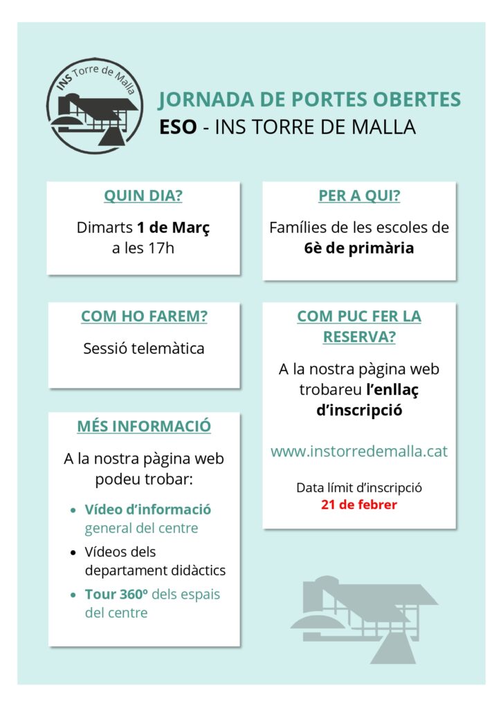 A continuació us podeu inscriure a la reunió telemàtica de portes obertes d’ESO de l’Institut Torre de Malla que es farà el dimarts 1 de març. La data límit d’inscripció a la reunió virtual és el 21/02/22