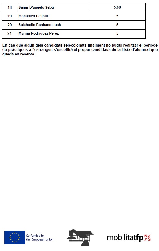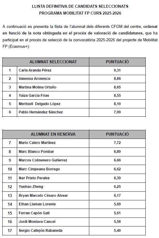 LLISTA DEFINITIVA CANDIDATS SELECCIONATS MOBILITAT FP CURS 2025-2026 (CFGM: SMX, ACO i GA)Per Aintzane Santacoloma / 10 de febrer de 2026 / Erasmus+ General Portada Tauler d'anuncis LLISTA DEFINITIVA CANDIDATS SELECCIONATS MOBILITAT FP CURS 2025-2026 CFGM