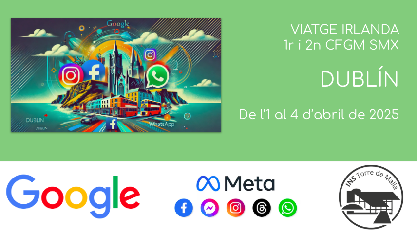 Des del Departament d’Informàtica de l’Institut Torre de Malla, estem molt contents d’anunciar que hem organitzat un viatge d’estudis a Dublín, Irlanda, amb l’alumnat del CFGM de Sistemes Microinformàtics i Xarxes, de l’1 al 4 d’abril.