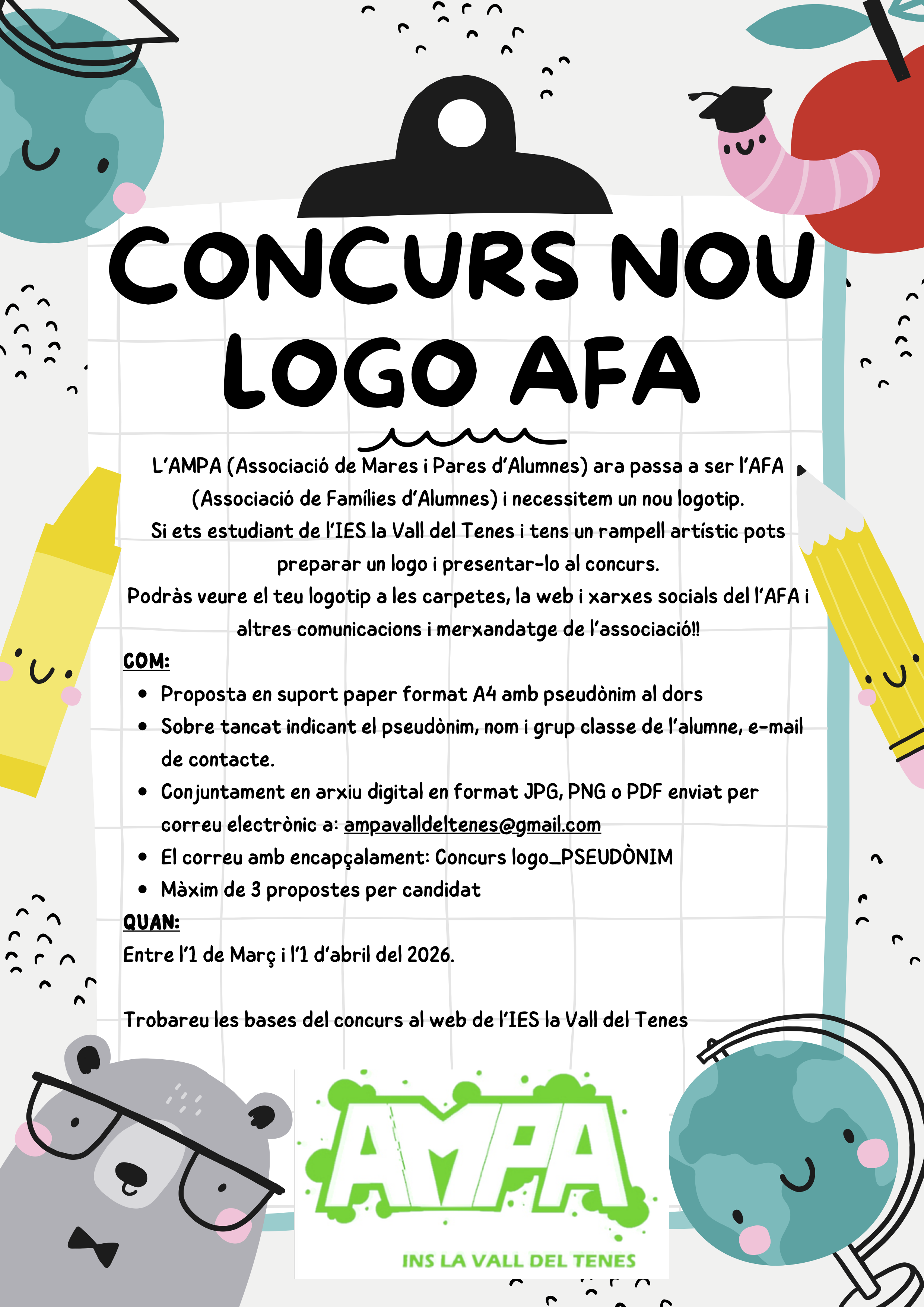 L’AMPA de l’IES Vall del Tenes amb motiu del canvi de denominació a Associació de Famílies d’Alumnes (AFA) organitza el present Concurs per al disseny del seu nou logotip oficial.