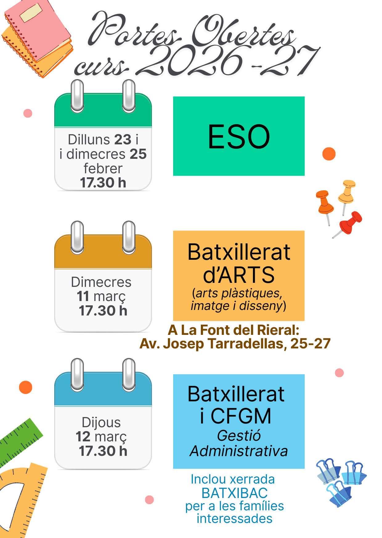 JORNADA DE PORTES OBERTES PER AL CURS 2026-27 Feu un comentari / Per admin / 29/01/2026 / General Formulari d’inscripció a les Portes Obertes