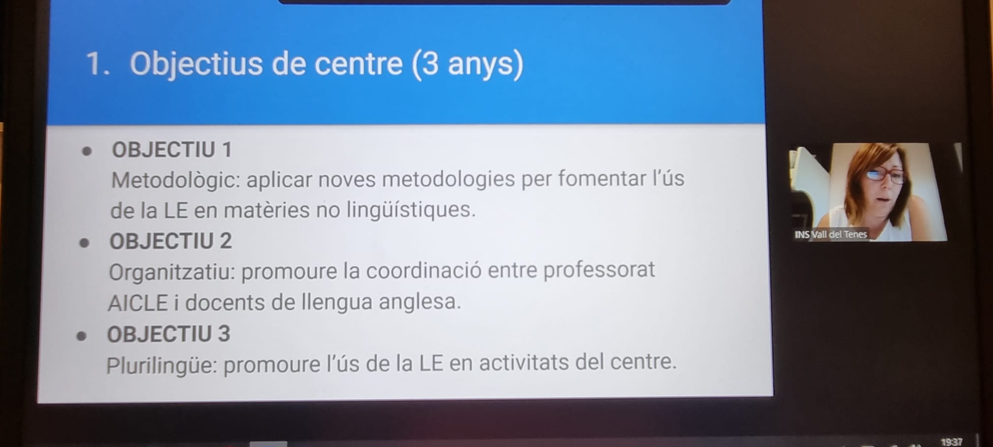 Aquest dimarts 26 de setembre, l’INS La Vall del Tenes hem estat convidats a participar a la Trobada pedagògica Generació Plurilingüe per explicar el nostre projecte als participants i equips directius de centre que s’inicien al programa GEP. La Mercè Mateo, coordinadora GEP de l’institut, és qui ha presentat i compartit l’experiència de l’institut a la trobada telemàtica. Gràcies, Mercè! Bona feina!