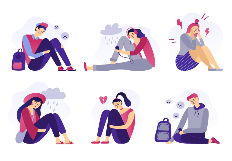 Depressed teenagers. Sadness student, unhappy stressed teen sad boy and crying girl. School stress, anxious introvert teen, lonely bullying abused teenager. Isolated flat vector illustration icons set… Llegeix més»