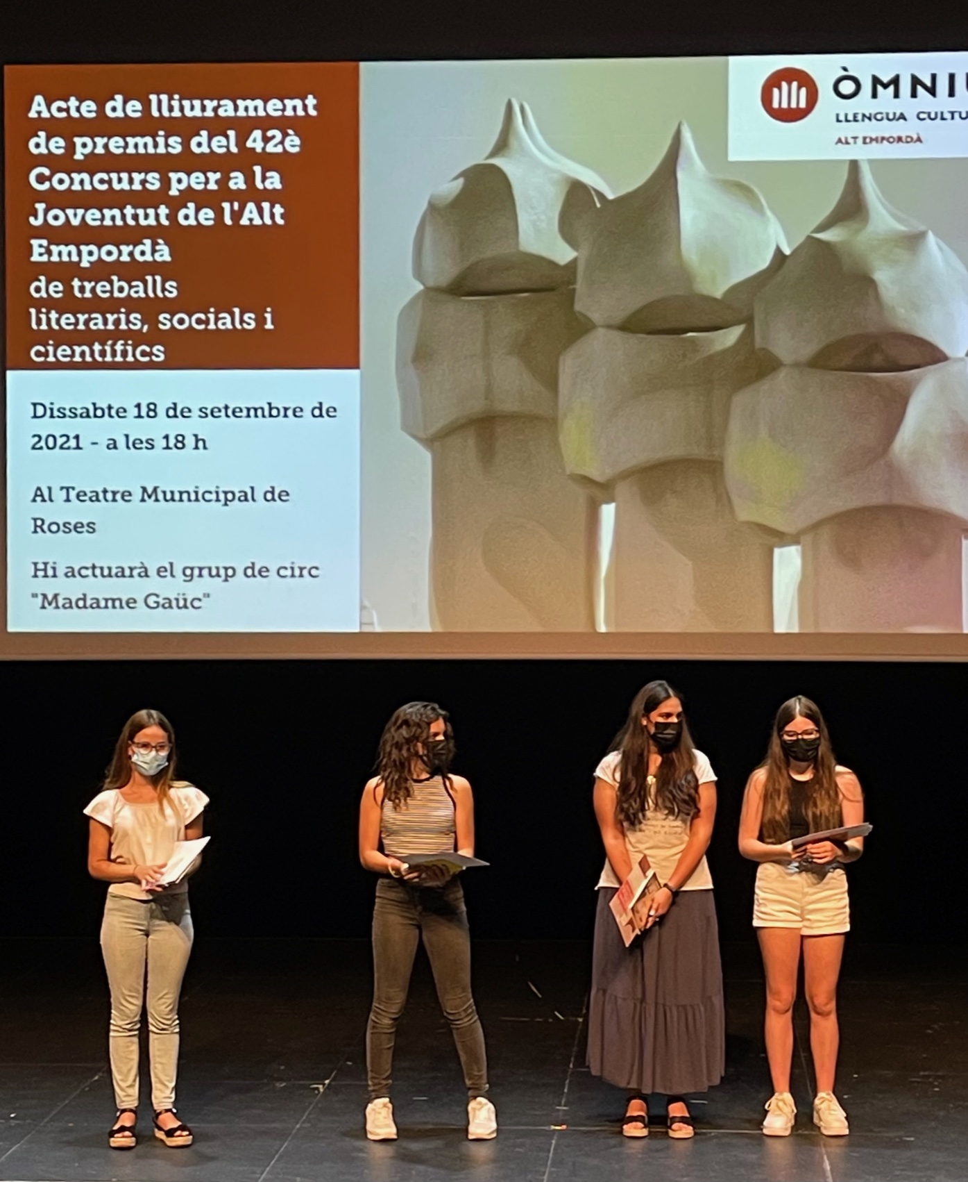 Dissabte, 18 de setembre, l’alumna Bruna Brusés, va rebre el premi Ma. Àngels Anglada d’Auca al Teatre Municipal de Roses, dins el 42è Concurs per a la joventut de l’Alt Empordà 2021, amb el seu treball Gaudint Gaudí, sota el pseudònim de Manequineco. Enhorabona !!