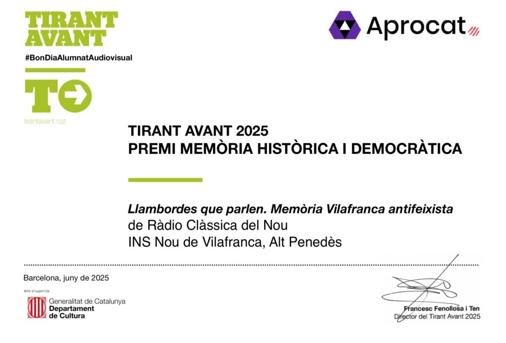 Pòdcast “Llambordes que parlen. Passeig per la memòria de la Vilafranca antifeixista”. Una publicació de Ràdio Clàssica del Nou en col·laboració amb el Departament de Ciències Socials per retre homenatge als vilafranquins i vilafranquines víctimes del nazisme, en el dia de la commemoració de l’alliberament del camp de concentració de Mauthausen (5 de maig de 1945).