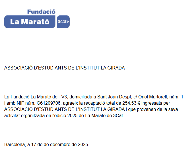 L’associació d’estudiants de l’institut La Girada ha col·laborat amb la fundació la Marató de TV3. Des de l’associació s’ha organitzat una cursa solidària on ha participat tot l’alumnat i professorat del centre. Gràcies a aquesta iniciativa s’han recaptat més de 250 € que serviran per col·laborar en l’edició 2025 de la Marató dedicada al Càncer.