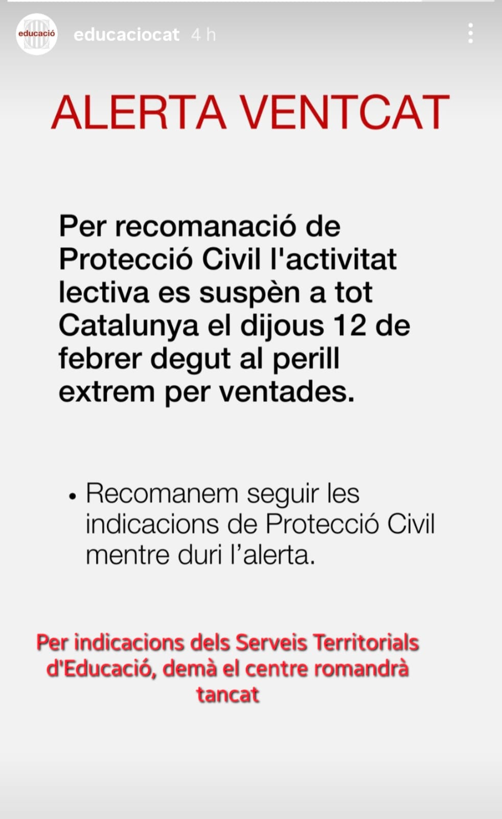 Seguint les instruccions rebudes per la Direcció del Servei Territorial al Penedès, un comuniquem que davant la previsió de fortes ventades i seguint les recomanacions de Protecció Civil, es tanquen els centres educatius a tot Catalunya aquest dijous 12 de febrer.