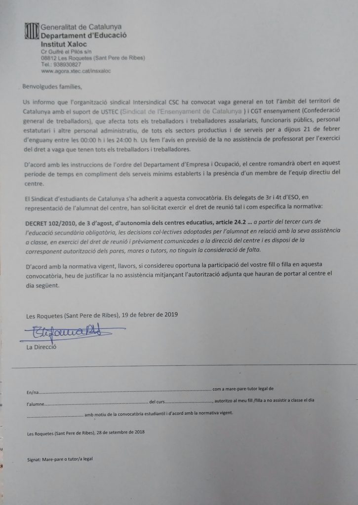 Convocatòria de Vaga General 21 de Febrer de 2019