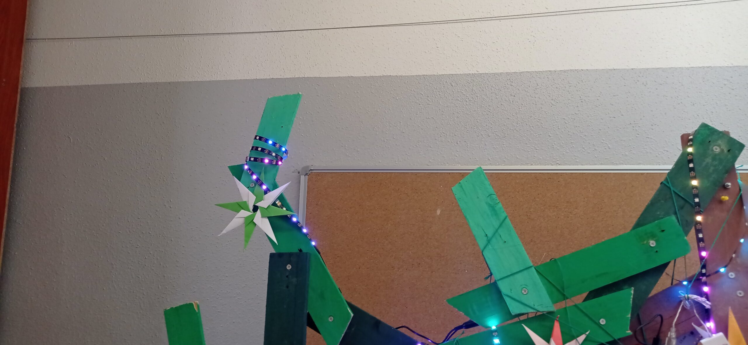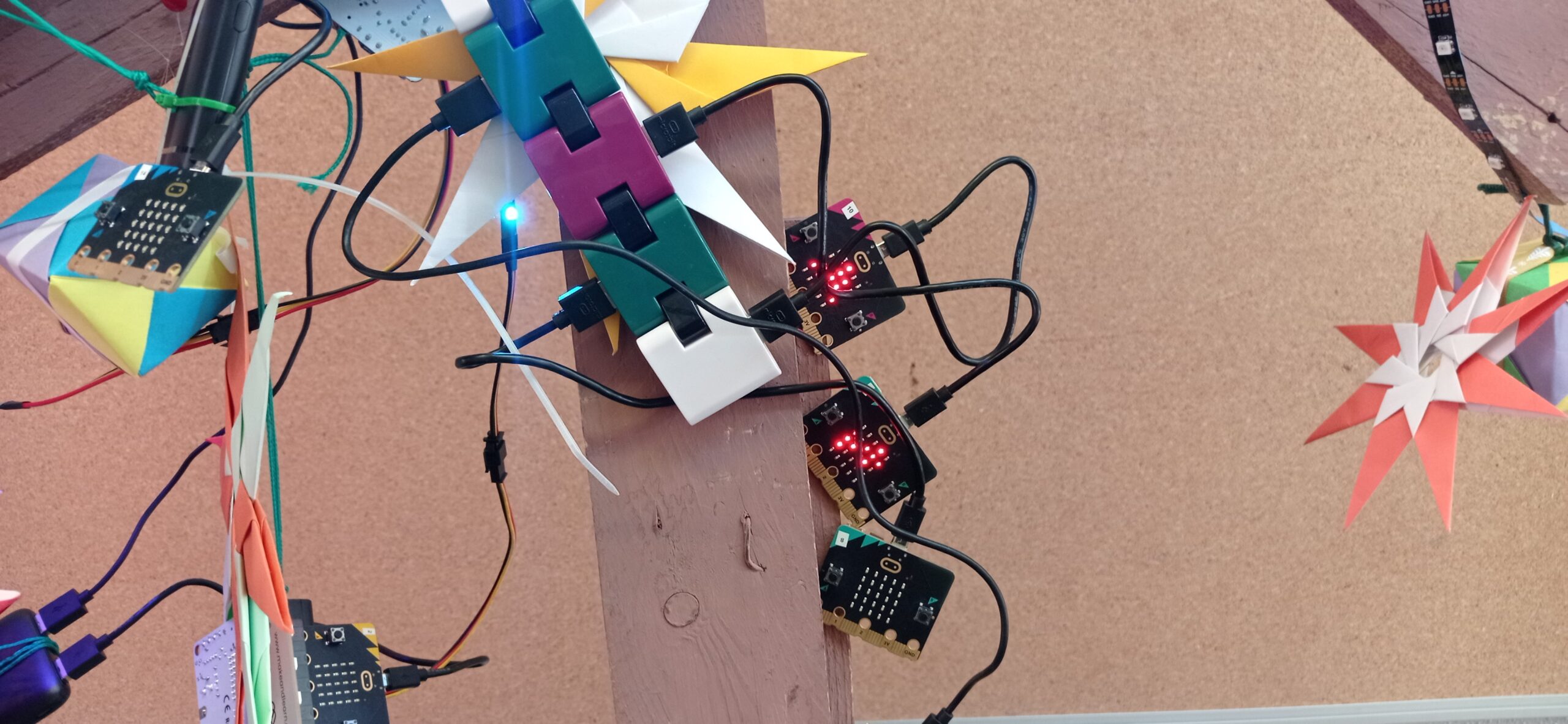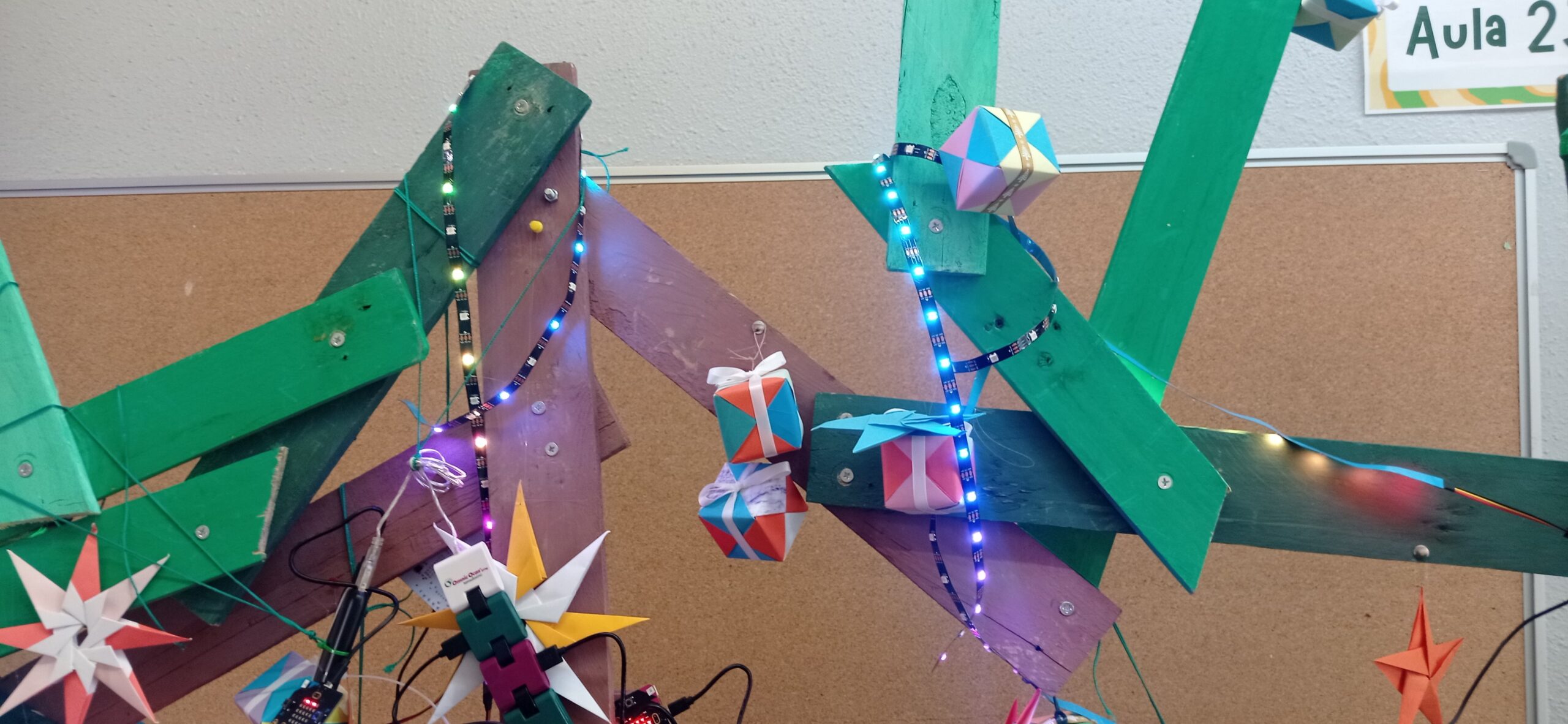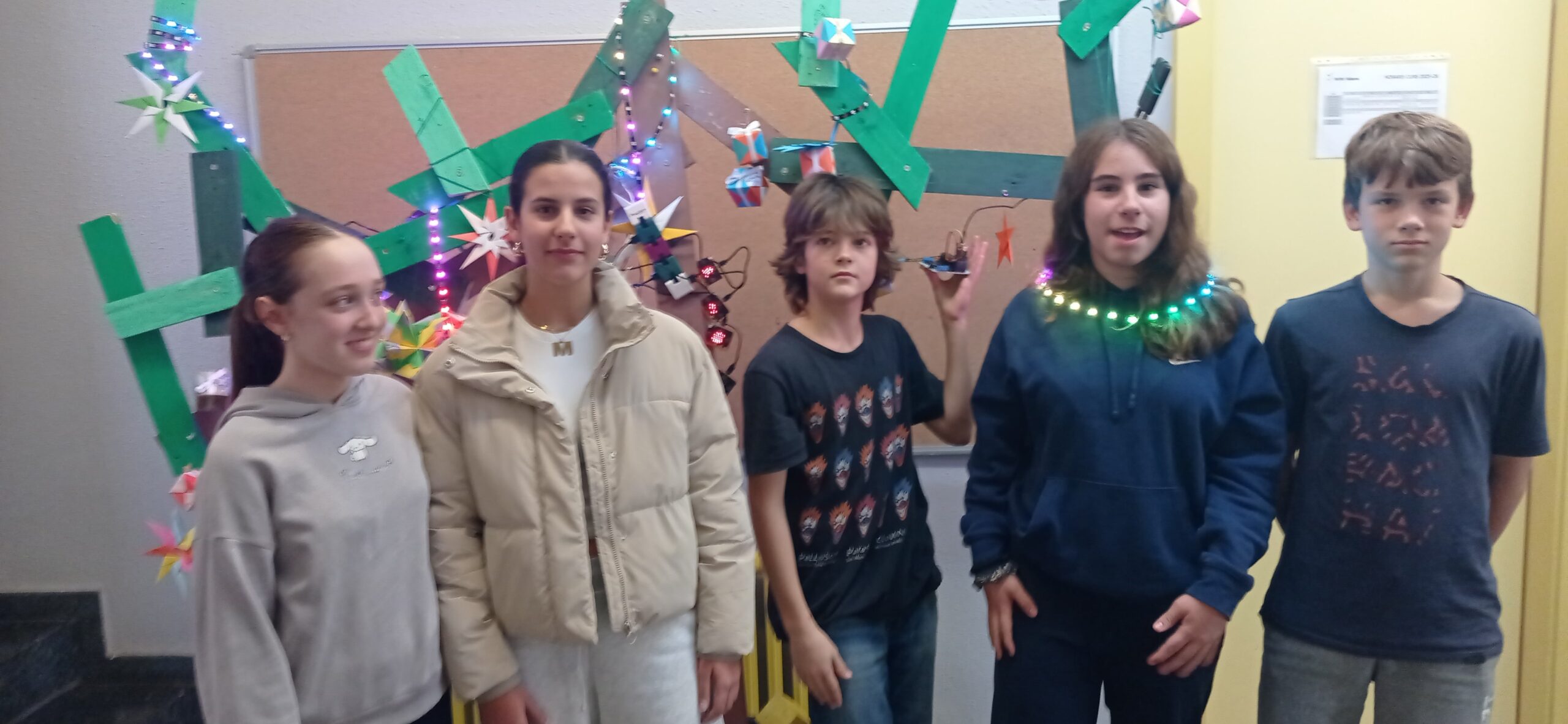 L’alumnat de 2n d’ESO des de la matèria de robòtica, ha col·laborat en el seu guarniment aplicant els coneixements apresos al llarg d’aquest trimestre, programant amb el llenguatge de blocs i el programa Makecode la placa micro:bit acoblada a la seva extensió Microshield i actuadors com la tira de neopíxels per omplir de llum, color, animacions i música el nostre arbre.