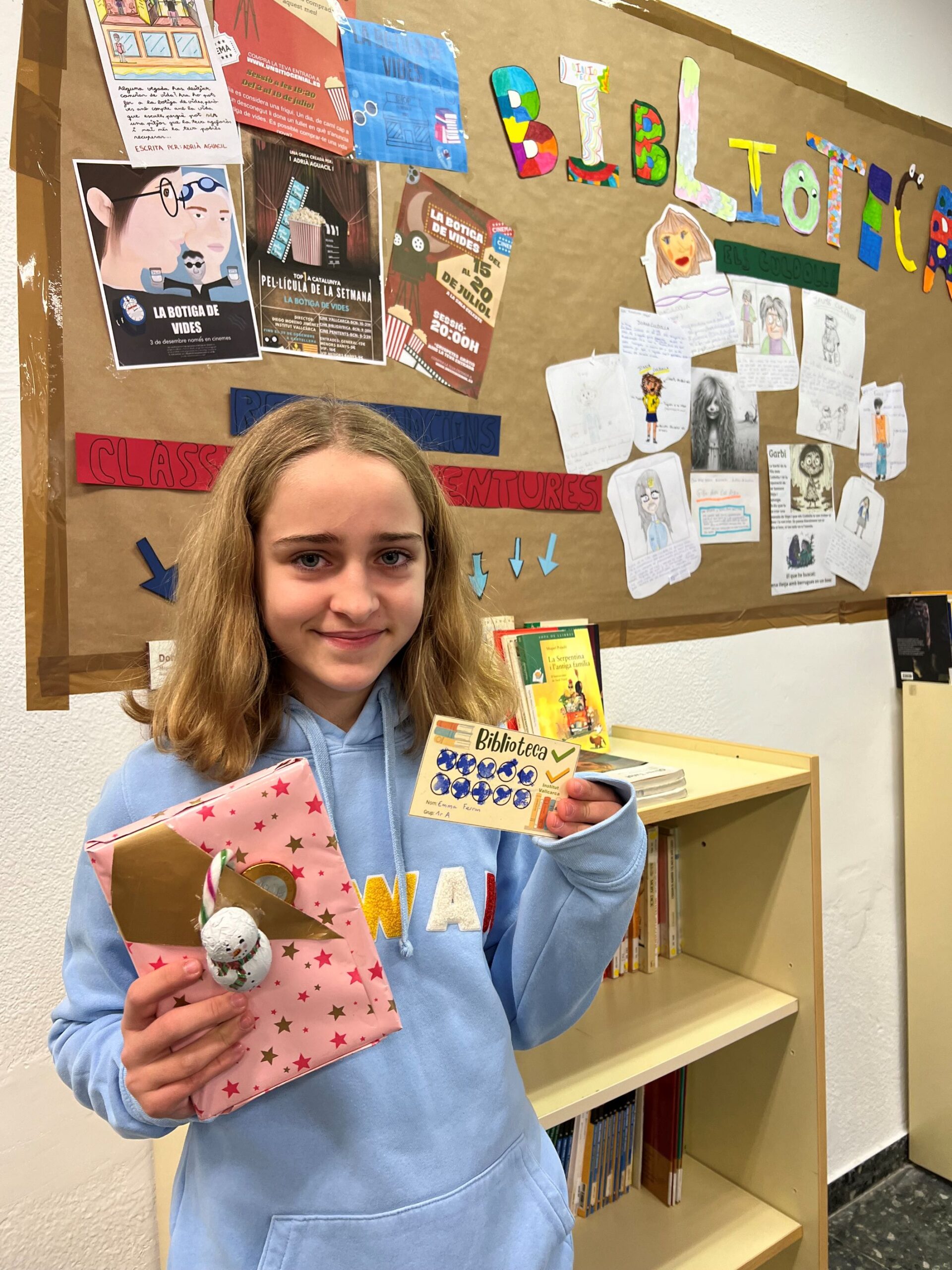 L’Emma ha fet tasques com; crear un cartell cinematogràfic per a la lectura de La botiga de vides de l’Adrià Aguacil, imaginar com seria la filla o el fill dels Culdolla de Roald Dahl, crear uns mots encreuats, un punt de llibre… i fins a deu tasques que li han donat punts pel carnet.