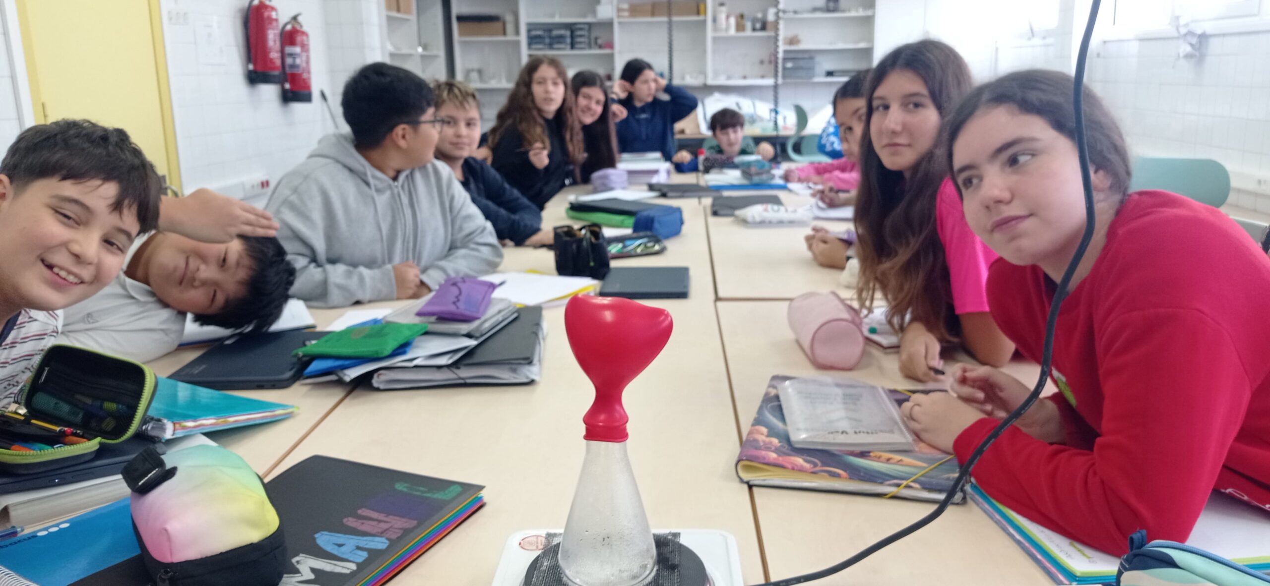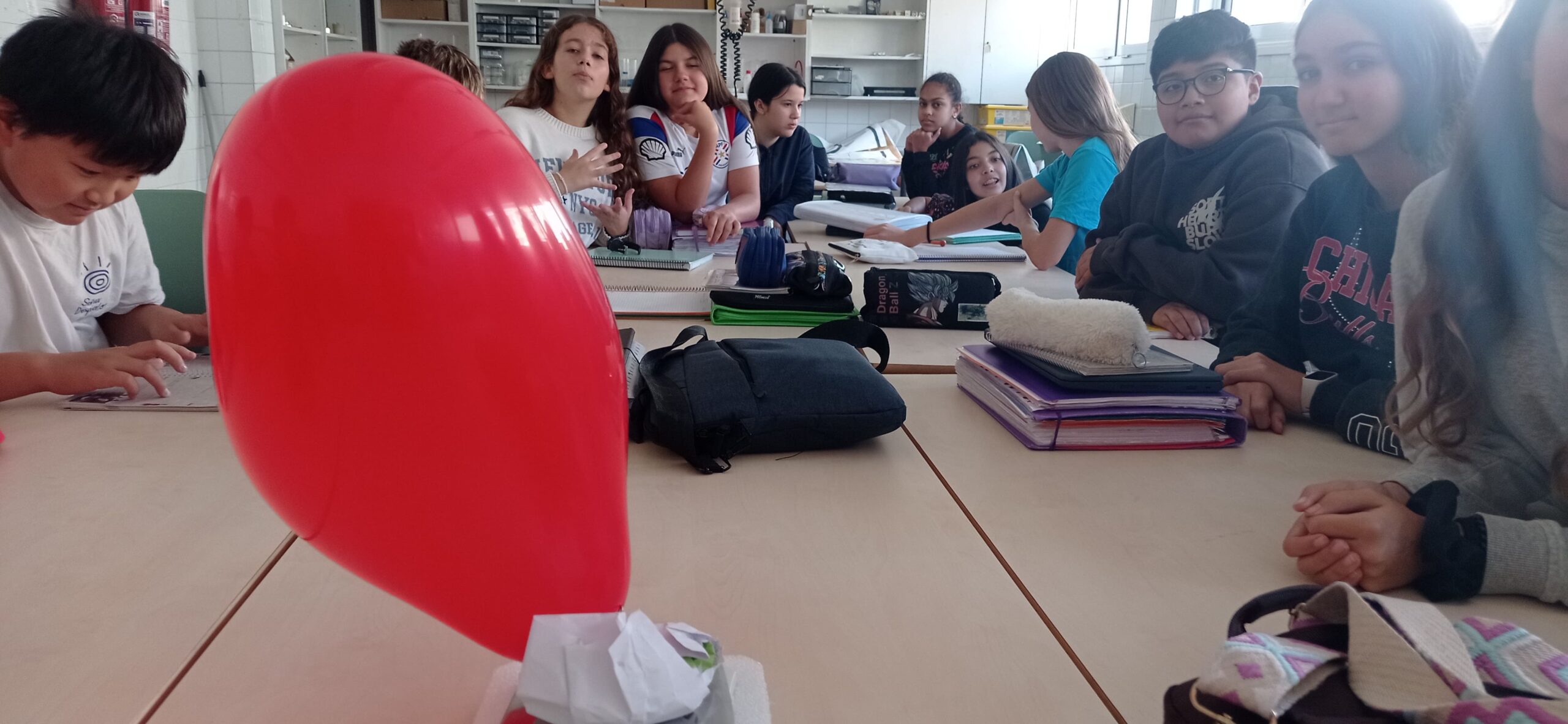 Un dels moments més destacats ha estat la realització de diferents experiments científics, com la simulació de la formació d’un núvol i pràctiques sobre la densitat de l’aire i els moviments convectius, elements clau per entendre vents, brises i dinàmica atmosfèrica. Igualment, a partir del cas real del salt estratosfèric de Félix Baumgartner, l’alumnat ha treballat per què els globus augmenten de volum a gran altitud i com varia la pressió a mesura que ens allunyem de la superfície terrestre.