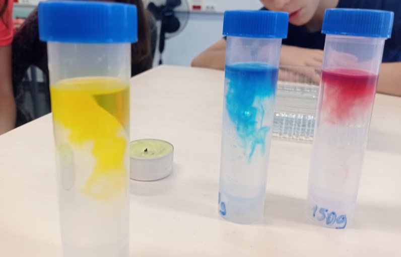 Hem esbrinat perquè segons la quantitat de sal que hi havia a cada mostra tenyida amb colorant alimentari les diferents dissolucions es barrejaven o no. També hem vist perquè en encendre un espelma dins d’un got feia pujar el nivell de l’aigua. A través d’aquests experiments hem après a utilitzar el mètode científic com a eina essencial a l’estudi de la ciència.