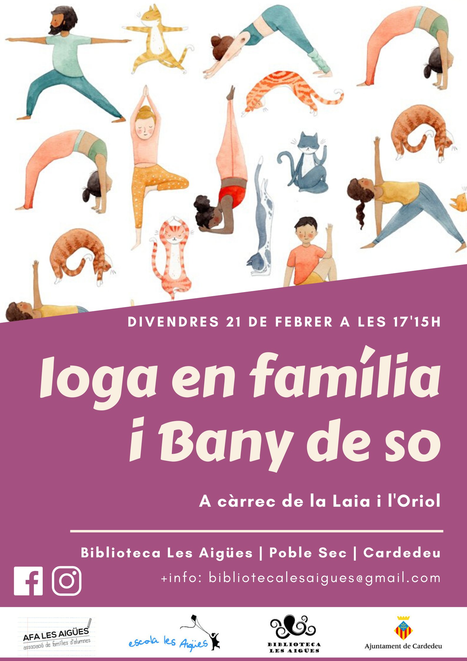 L’AFA i la Biblioteca Les Aigües organitzen una sessió de ioga familiar i un bany de so al gimnàs el divendres 21 de febrer a les 17:15 hores. No us ho perdeu!