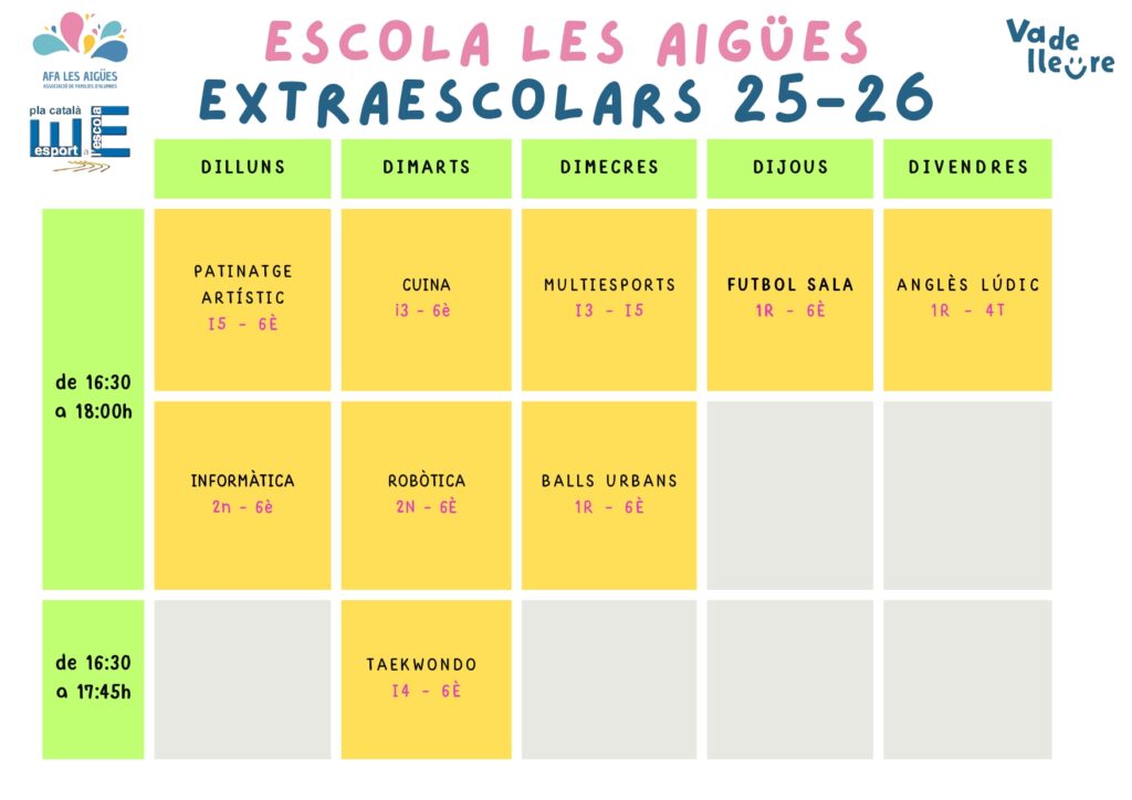 Activitats extraescolars del curs 25-26 Feu un comentari / Per admin / 12/12/2025 / Portada Aquest curs 25-26, l’AFA Les Aigües ofereix totes aquestes activitats extraescolrs organitzades per Vadelleure.