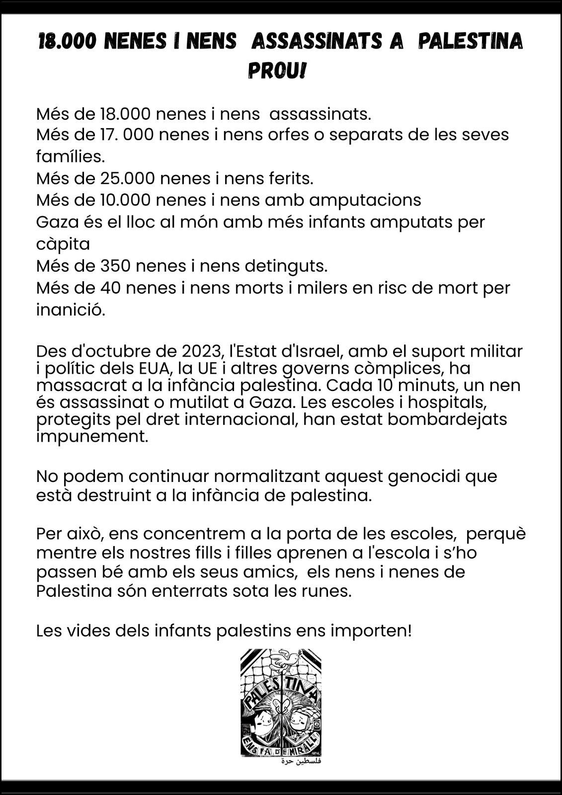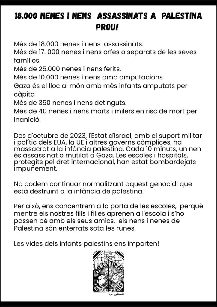 El divendres 13 de juny a la sortida de l’escola de 2/4 de 4, la comunitat de Les Aigües va fer una concentració al pati d’ed. primària per trencar el silenci pel genocidi de Gaza. Membres de l’AFA Les Aigües, de l’escola i de la Biblioteca del Poble Sec van llegir davant de tota la comunitat el manifest i el text Cal estar en silenci quan els infants dormen.