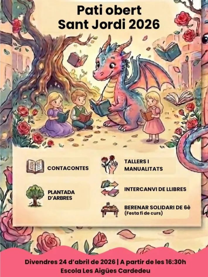 Aquest divendres 24 d’abril, l’endemà de Sant Jordi, la Biblioteca Les Aigües, l’AFA Les Aigües i les famílies de 6è organitzen una sessió especial de pati obert de Sant Jordi a partir de 2/4 de 5 al pati de l’escola.