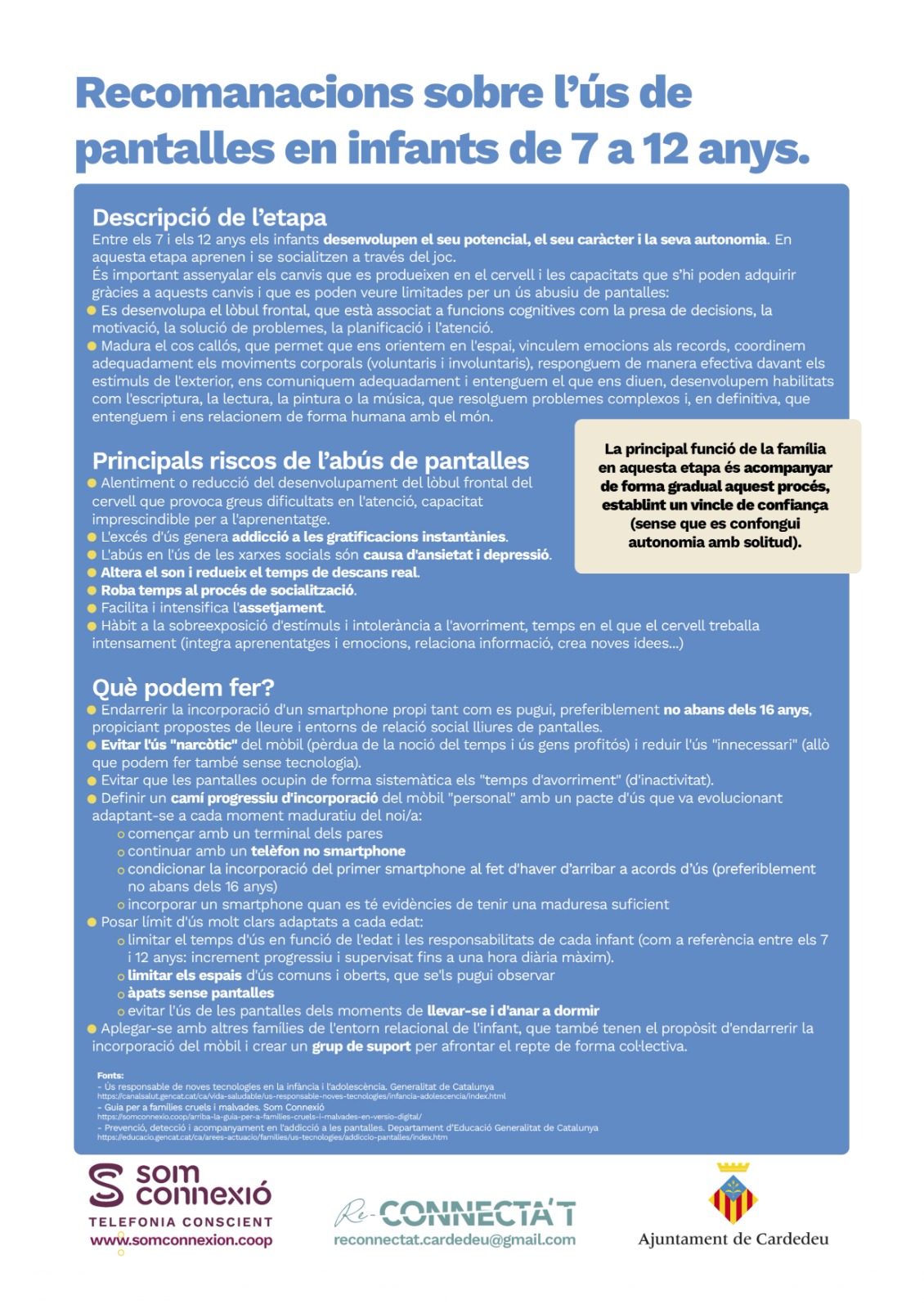 La plataforma Re-connecta’t està formada per famílies de Cardedeu i vol generar reflexió i acció entorn del tema de l’ús de les pantalles en els infants. Han comptat amb l’assessorament de l’equip d’Infància i pantalles de Som Connexió i el suport de l’Ajuntament de Cardedeu per elaborar una guia de recomanacions de la qual en fem difusió a totes les famílies des dels centres educatius de la vila. S’està treballant coordinadament tots els centres del municipi per establir un marc de referència compartit. Si us voleu baixar el document en format pdf podeu clicar aquí.