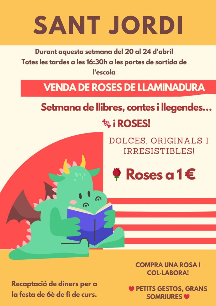 Durant la setmana de Sant Jordi, cada tarda roses de llaminadura a 1€ Feu un comentari / Per admin / 20/04/2026 / Portada Durant la setmana de Sant Jordi, cada tarda a la sortida de l’escola hi haurà parades roses de llaminadura organitzades per les famílies de 6è per recaptar fons per la festa de fi de curs.