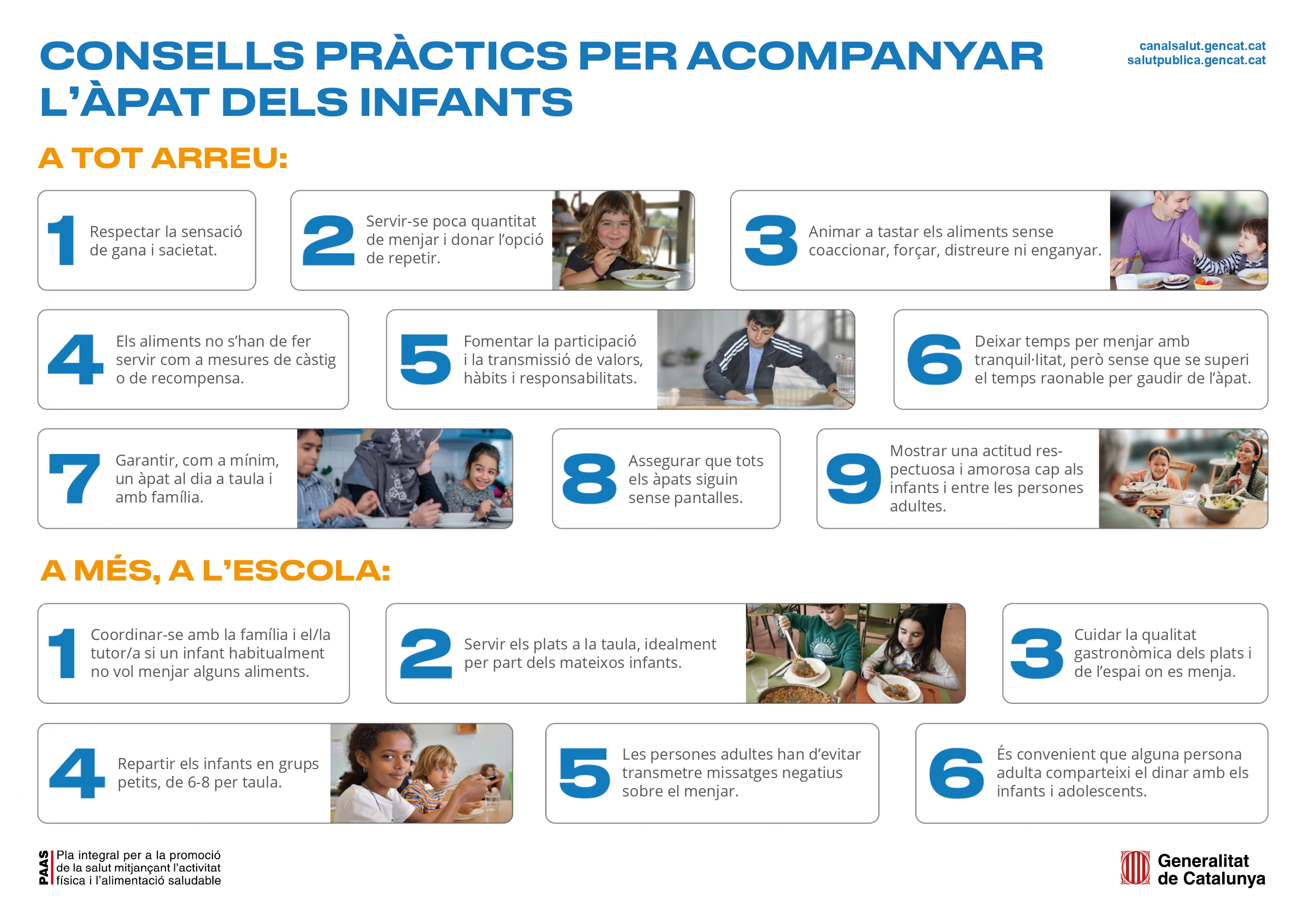 L’Agència de salut pública de Catalunya ha editat el document Acompanyament els àpats dels infants – Consells per a les famílies i per als menjadors escolars, el qual us podeu descarregar clicant aquí.
