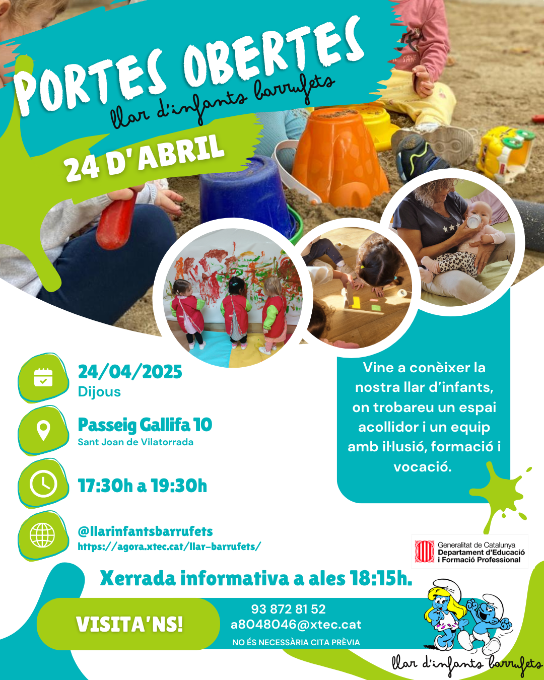 La Llar d’Infants Barrufets us convida a conèixer el nostre centre en la Jornada de Portes Obertes, que tindrà lloc el proper 28 d’abril a la tarda.