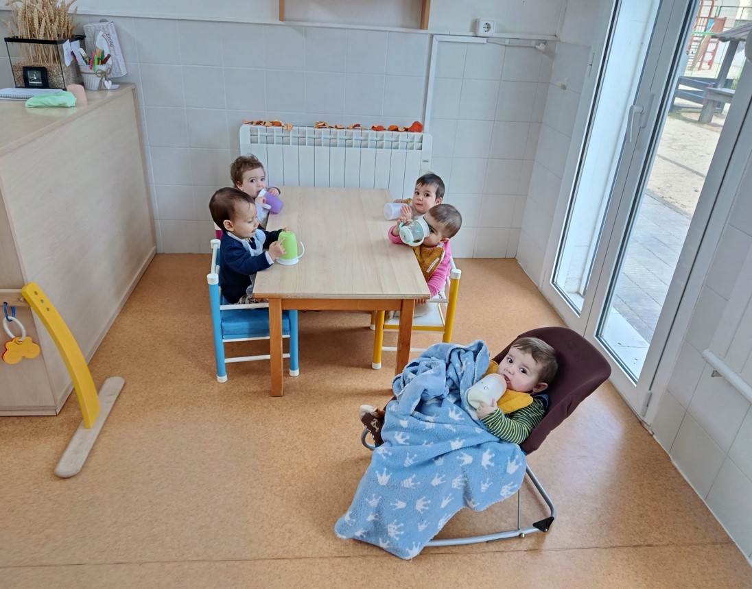 Pel que fa a l’alimentació, cada infant menja el que li correspon segons el seu moment evolutiu, sempre d’acord amb la família i seguint les recomanacions pediàtriques. Tenim molt presents les al·lèrgies i les intoleràncies. Alguns infants prenen biberó, amb llet materna o de fórmula. D’altres s’inicien amb l’alimentació complementària, així doncs alguns mengen farinetes; d’altres aliments sòlids xafats per introduir noves textures, i d’altres mengen el mateix menú que els infants més grans.
