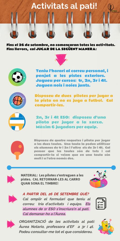 Activitats esportives Feu un comentari / Per admin / 26 de setembre de 2022 / ACTIVITATS AL PATI BLOG ACTIVITAT FÍSICA I SALUT