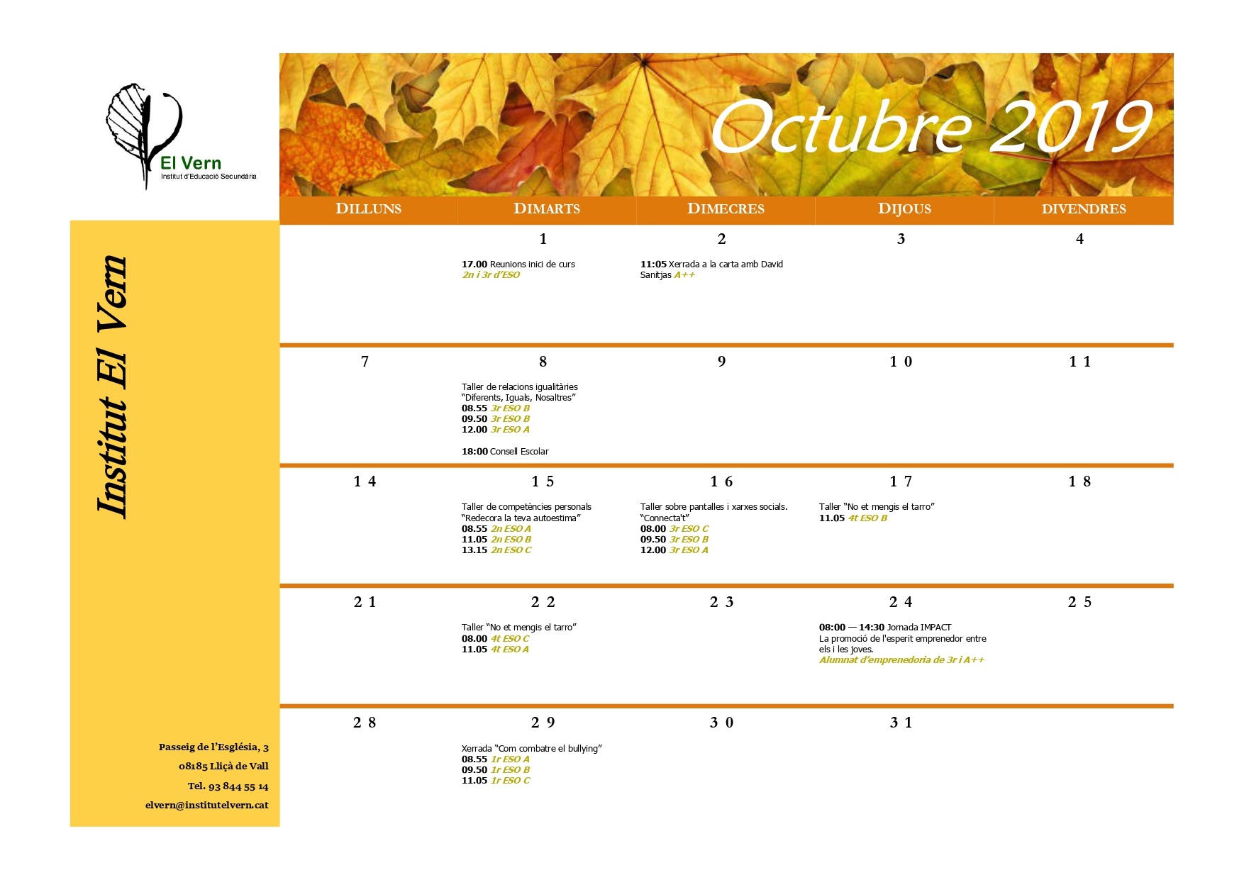 Calendari octubrePer admin / 30 de setembre de 2019 / PORTADA Descarrega’t el calendari en format pdf clicant AQUÍ