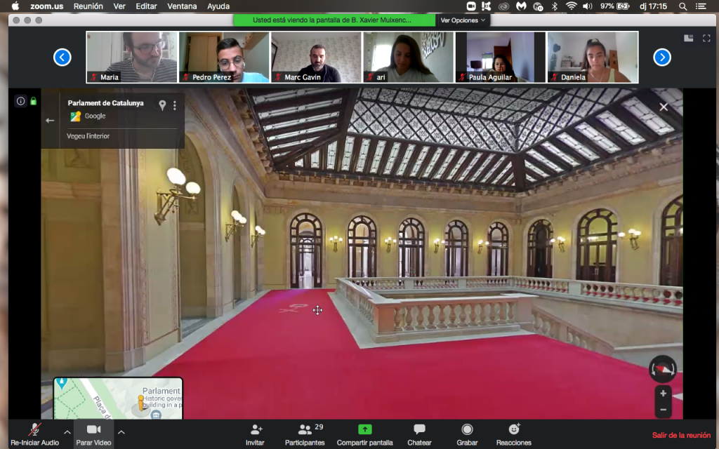 A través de vídeo conferències guiades, les especialistes, han acompanyat a l’alumnat a conèixer l’edifici, com ara el saló de sessions per a veure l’hemicicle, la sala dels passos perduts o el saló rosa, la dels canelobres o les diverses sales on es reuneixen les comissions. També ens han mostrat singularitats del Palau del Parlament, com l’arquitectura de l’edifici, els diferents materials de construcció, com canvien les decoracions segons la sala, etc.