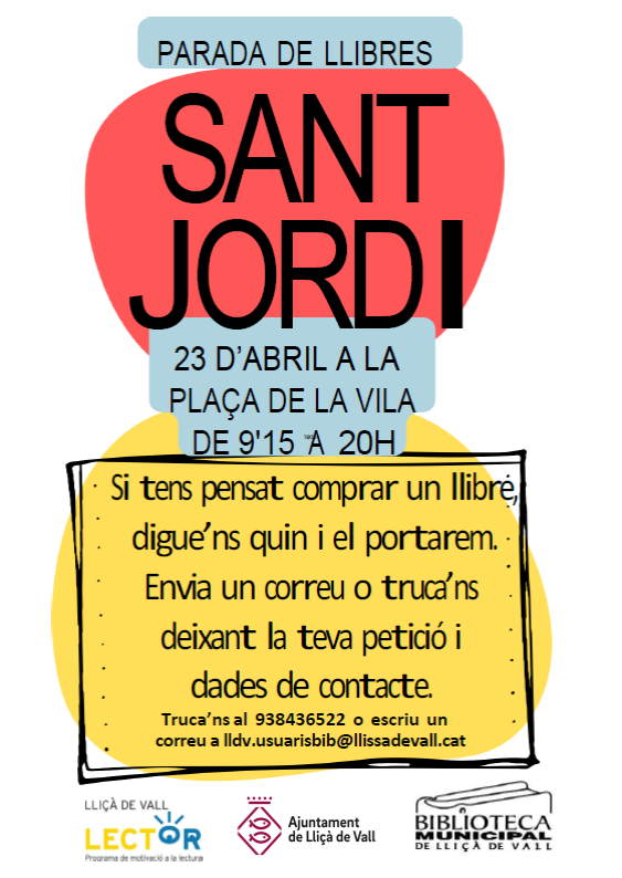 A la parada hi haurà llibres per a totes les edats i estarà oberta de 9.15 a 20h. Us convidem a fer-hi una ullada i aprofitar per adquirir al municipi els vostres llibres de Sant Jordi. Si ja sabeu quin llibre voldreu, podeu reservar-lo. Al cartell podreu trobar les dades de contacte:
